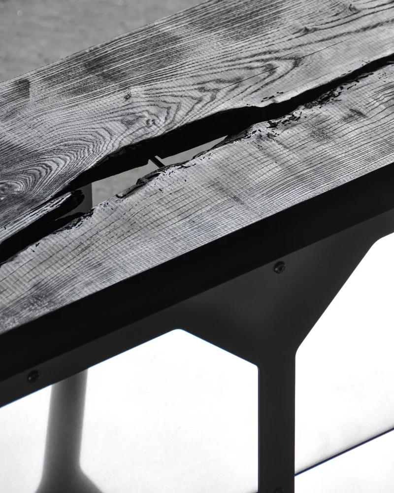 The console is available in multiple configurations: four openings, three openings, or two openings; with double-sided openings or one face closed. It can be finished with either a wood or aluminum top. The ebonized ash surface introduces depth and warmth, subtly contrasting with the cool metallic frame. Both functional and sculptural, the JNK540 Console is conceived as a versatile object that adapts to different spaces while maintaining a clear contemporary identity.
