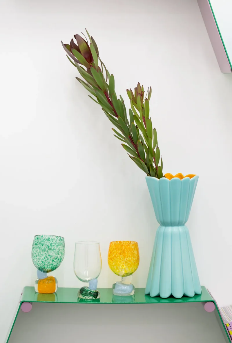 The glassware reflects the designer’s need to surround herself with more colourful materials and shapes and work with therapeutic methods that bring her joy in the design process.