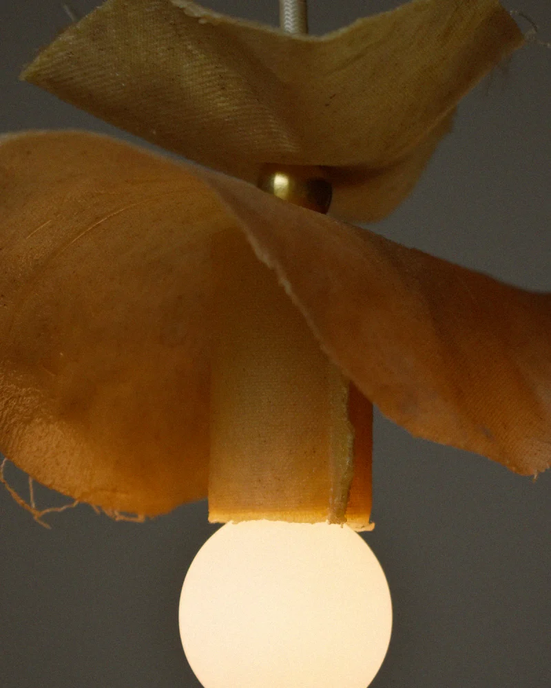 Judie is a sculptural pendant light with a poetic presence, where material seems to float weightlessly. Composed of carefully treated and shaped fabric, it evokes a blossoming corolla suspended in a moment of delicate stillness. A soft, diffused glow emanates from the opaline sphere, engaging in a subtle dialogue with the natural textures and raw edges of the textile. Brass accents gently punctuate the composition, offering a refined and balanced contrast.