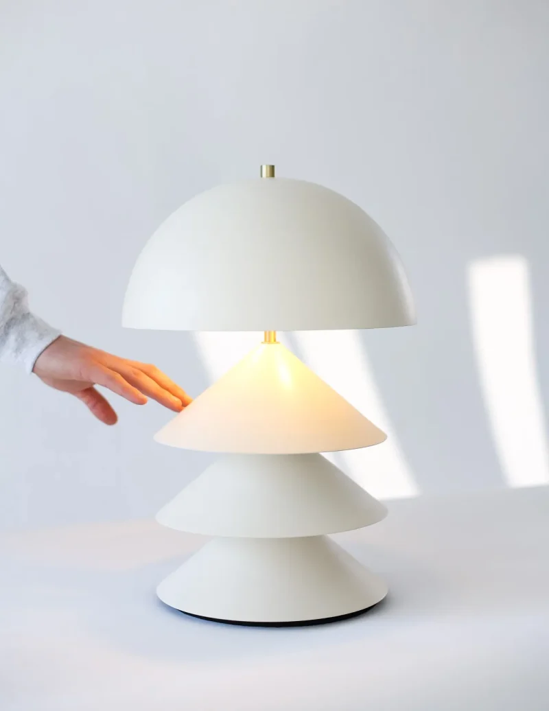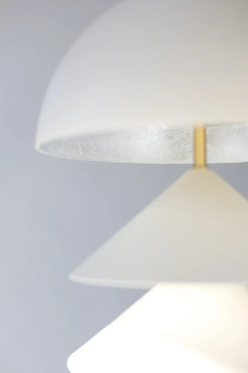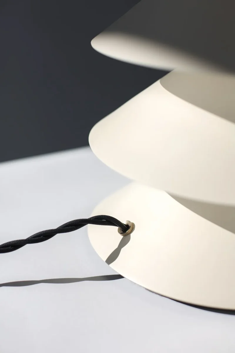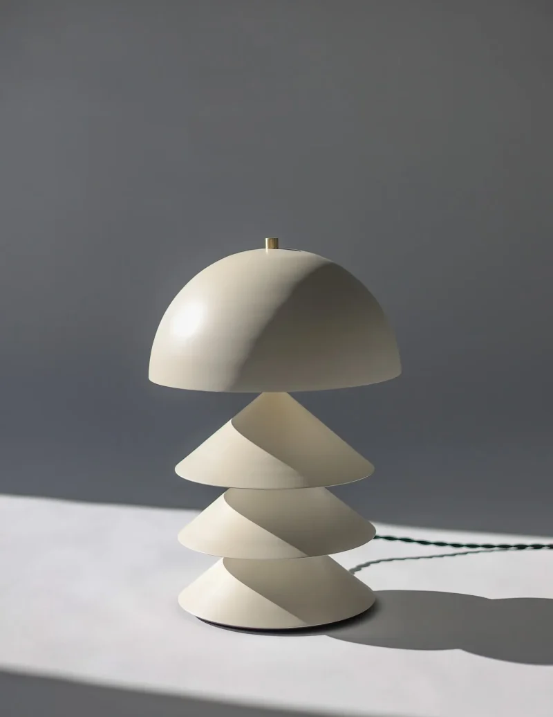 The Junius lamp makes a bold statement with its geometric stacked elements that appear almost to float above one another. The lamp is constructed with a lacquered steel shade and body, brass hardware, and a felt base. Inside the shade a surprise of hand-gilded genuine silver leaf reflects and amplifies the light emitting from the lamp.