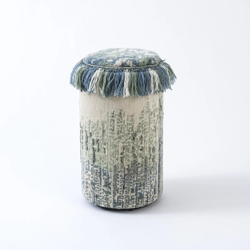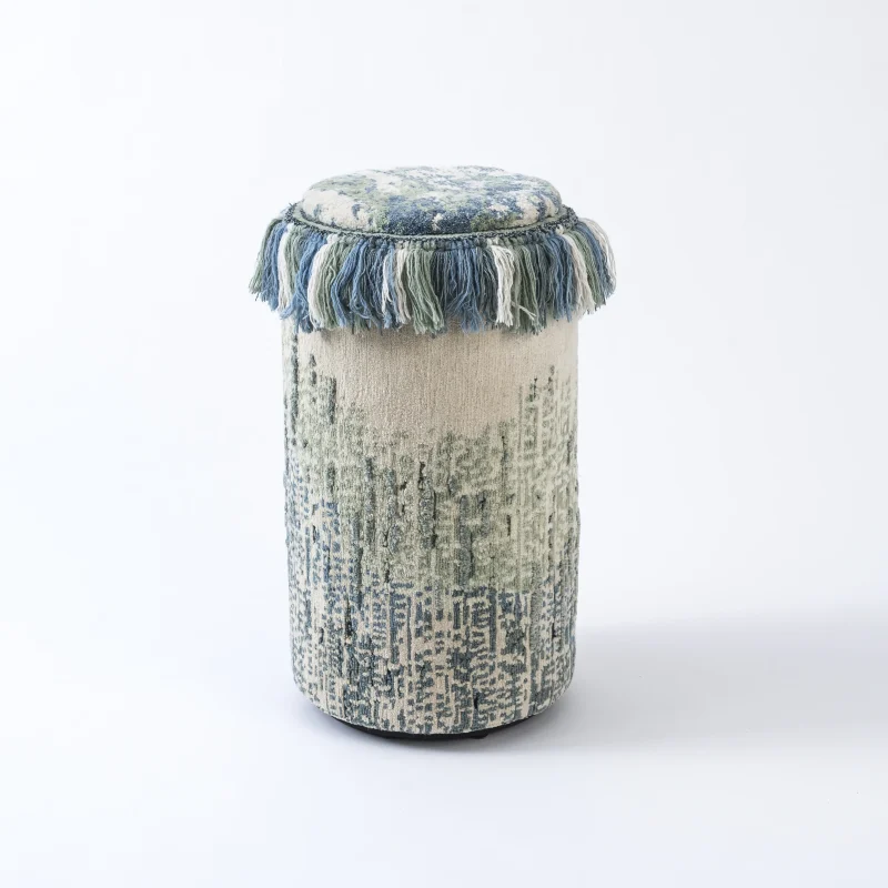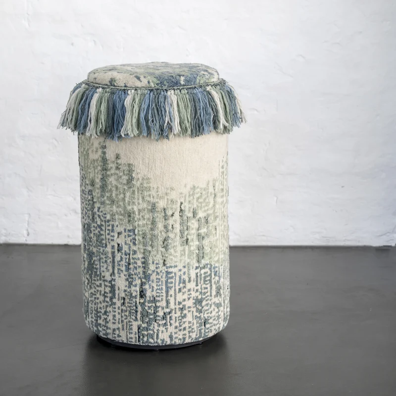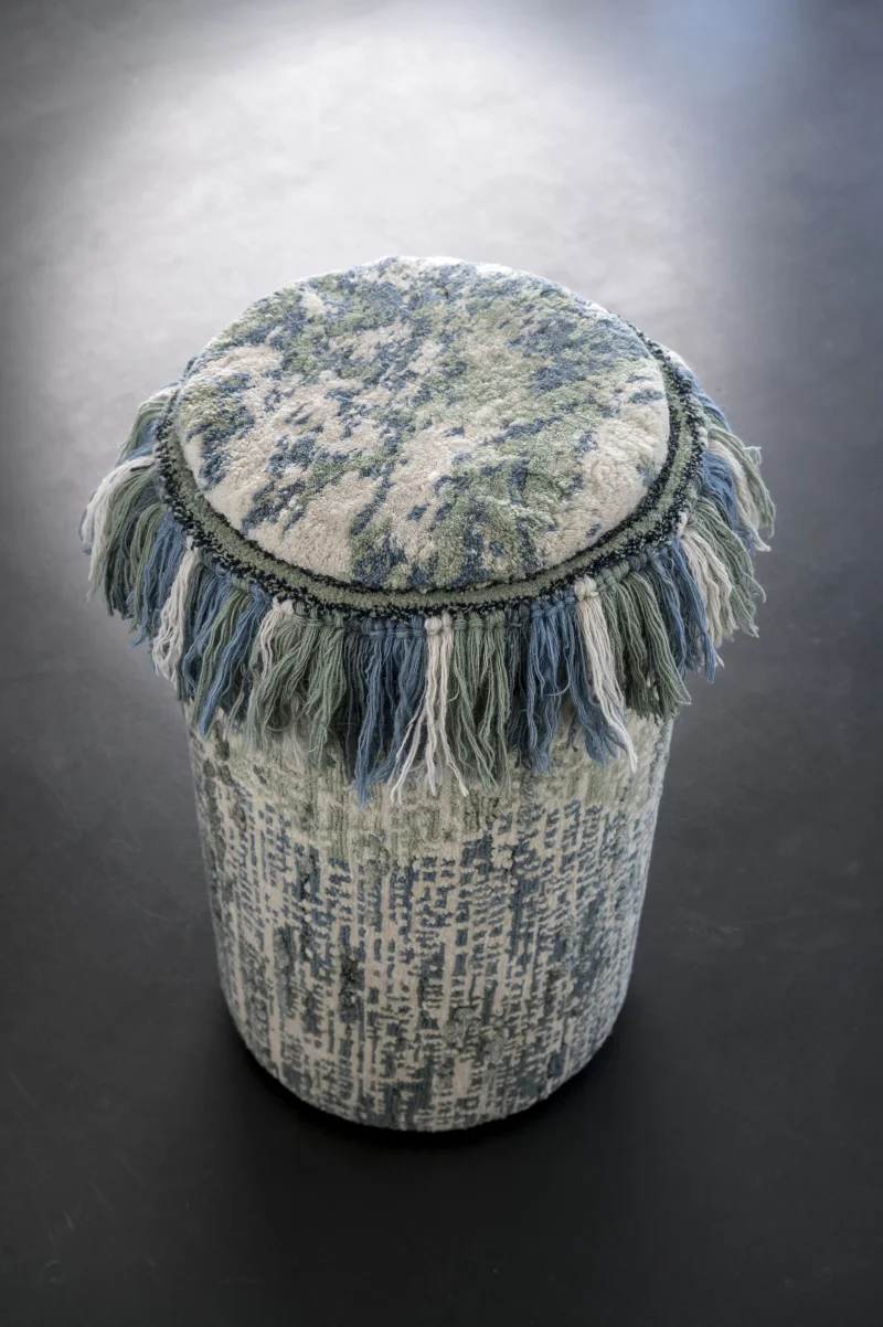 The graphic pattern of the ‘Kailani’ pouf reflects the fascinating play of water lines in an inspiring way, capturing the to and fro of the glittering water. The depth of the sea, the reflections of the sun and the dynamic play of the waves on the beach: with this picture, Mareike Lienau wants to visualize a transcultural space of memory, which she has set herself the task of creating.