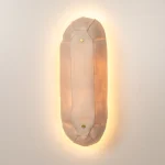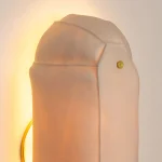 Tactile and textured porcelain wall sconce light in a bulbous racetrack shape. The translucent porcelain diffuser casts a warm-colored glow when lit.