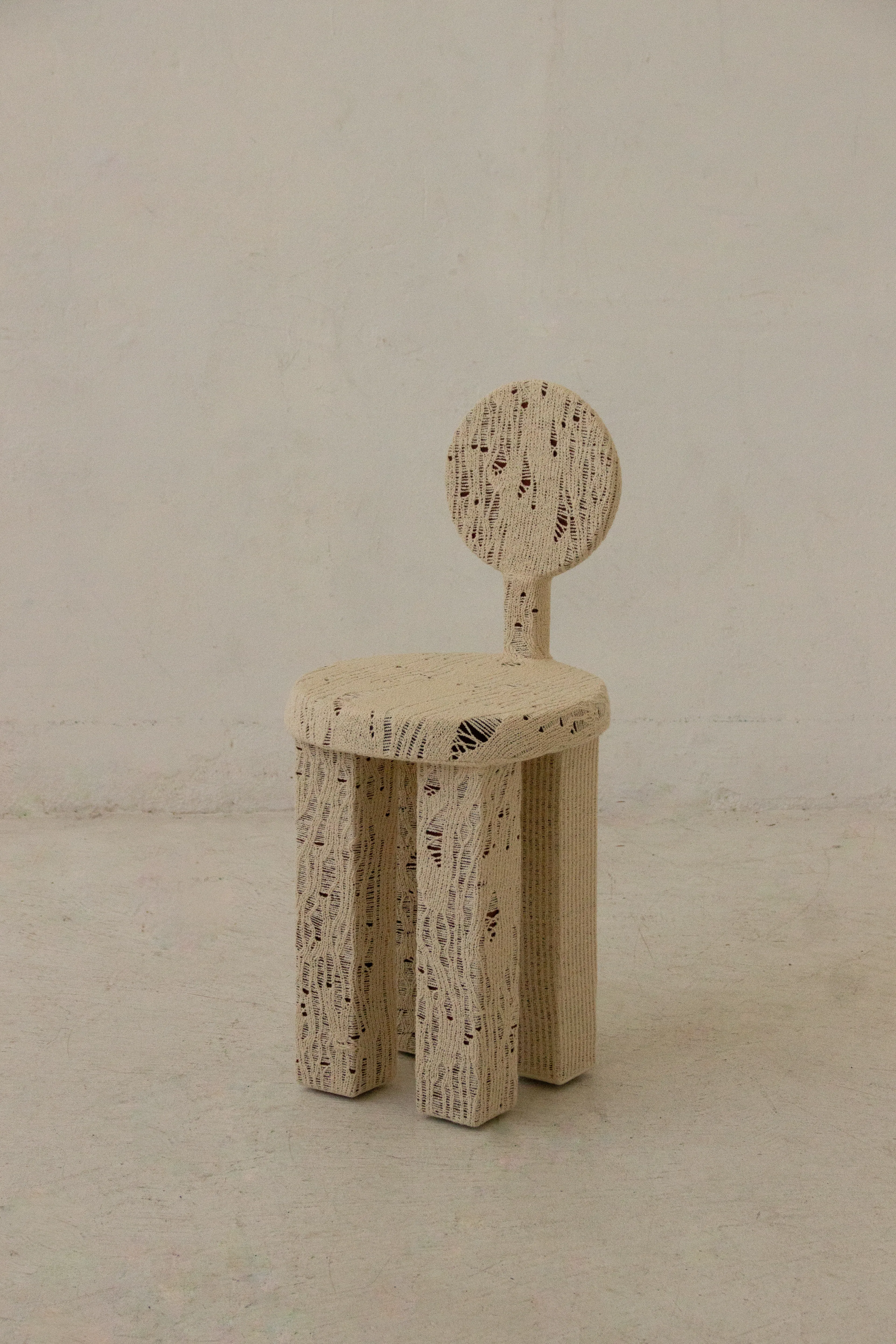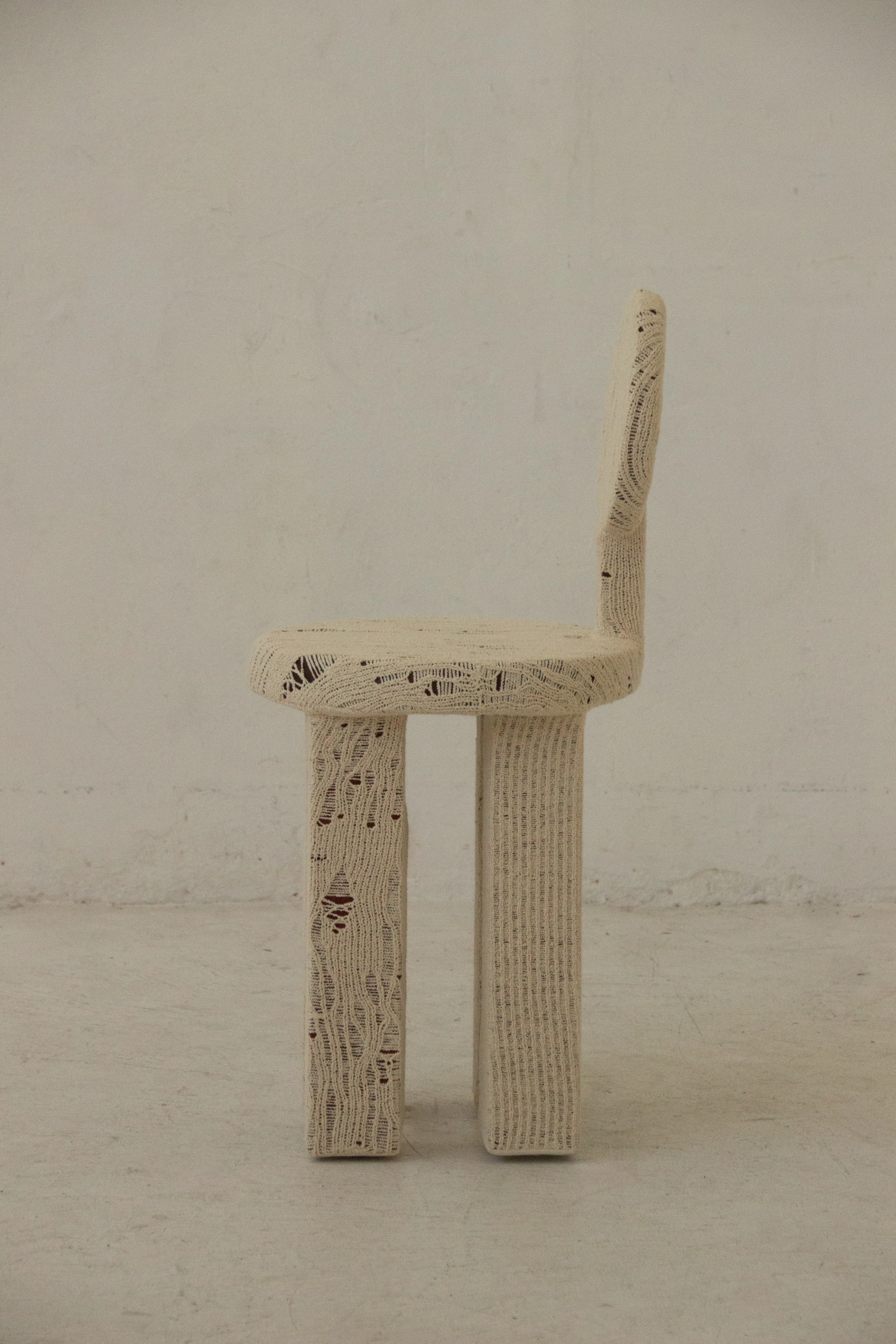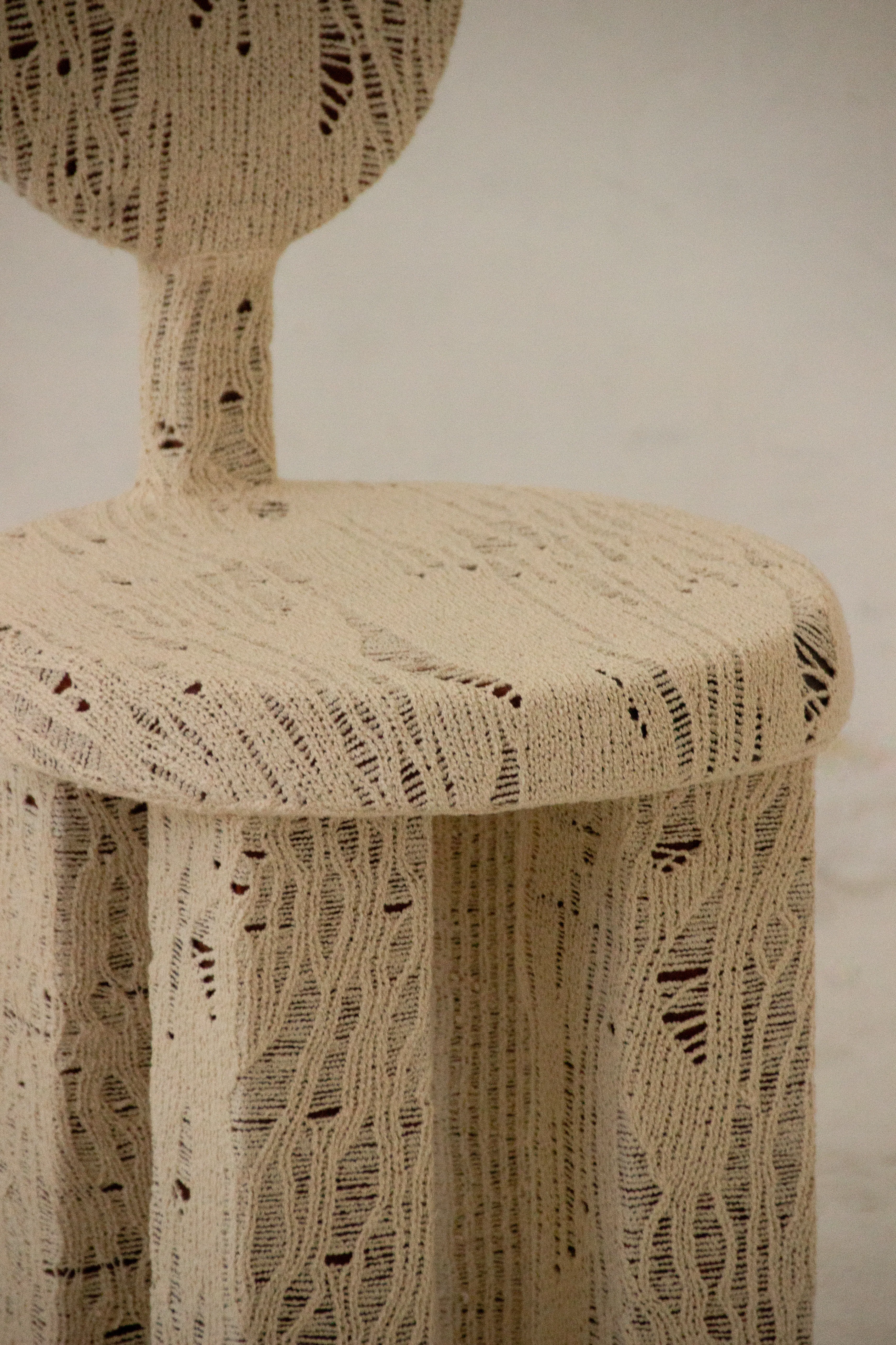This piece encapsulates the experiment between these two mediums. Through classical wood working knowledge, hand-shaped timber forms are wrapped in knit, using an organic laddering technique and traditional tailoring methods, to prompt associations of land surfaces, DNA, and mycelium. This piece expresses itself through a relatable, somewhat characterised body for the home.