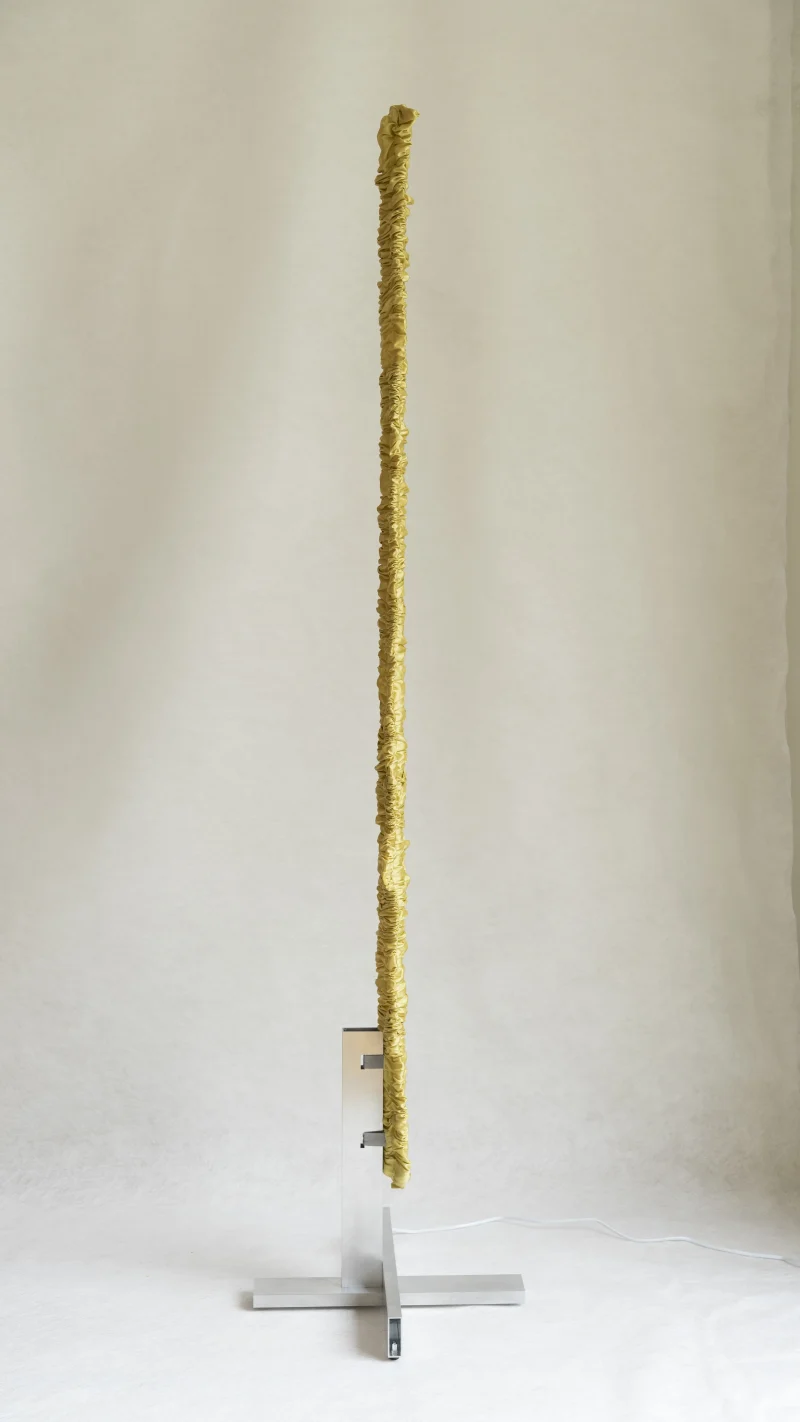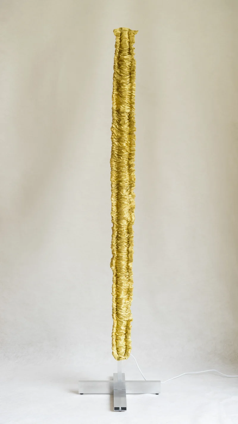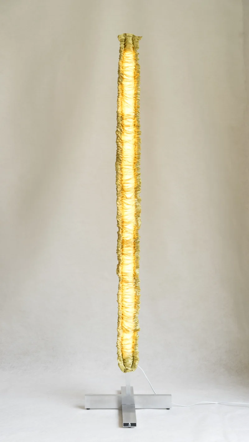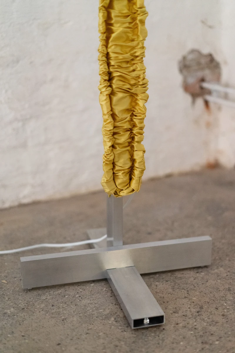 Knock-off-Neon by Ebba Lindgren is a led-tube dressed in butter yellow silk, with a sleek aluminum base and a secret heart. It mimics the colorful light of neon signs, but with a softer glow and touch. The industrial aluminum profiles contrast well with the ruched silk. Turned off, the folds in the silk create a lot of depth. The shade and the shiny highlights give it a compelling structure. Turned on it emits a warm yellow glow. It’s a very tactile and sensual lamp, both turned on and turned off.