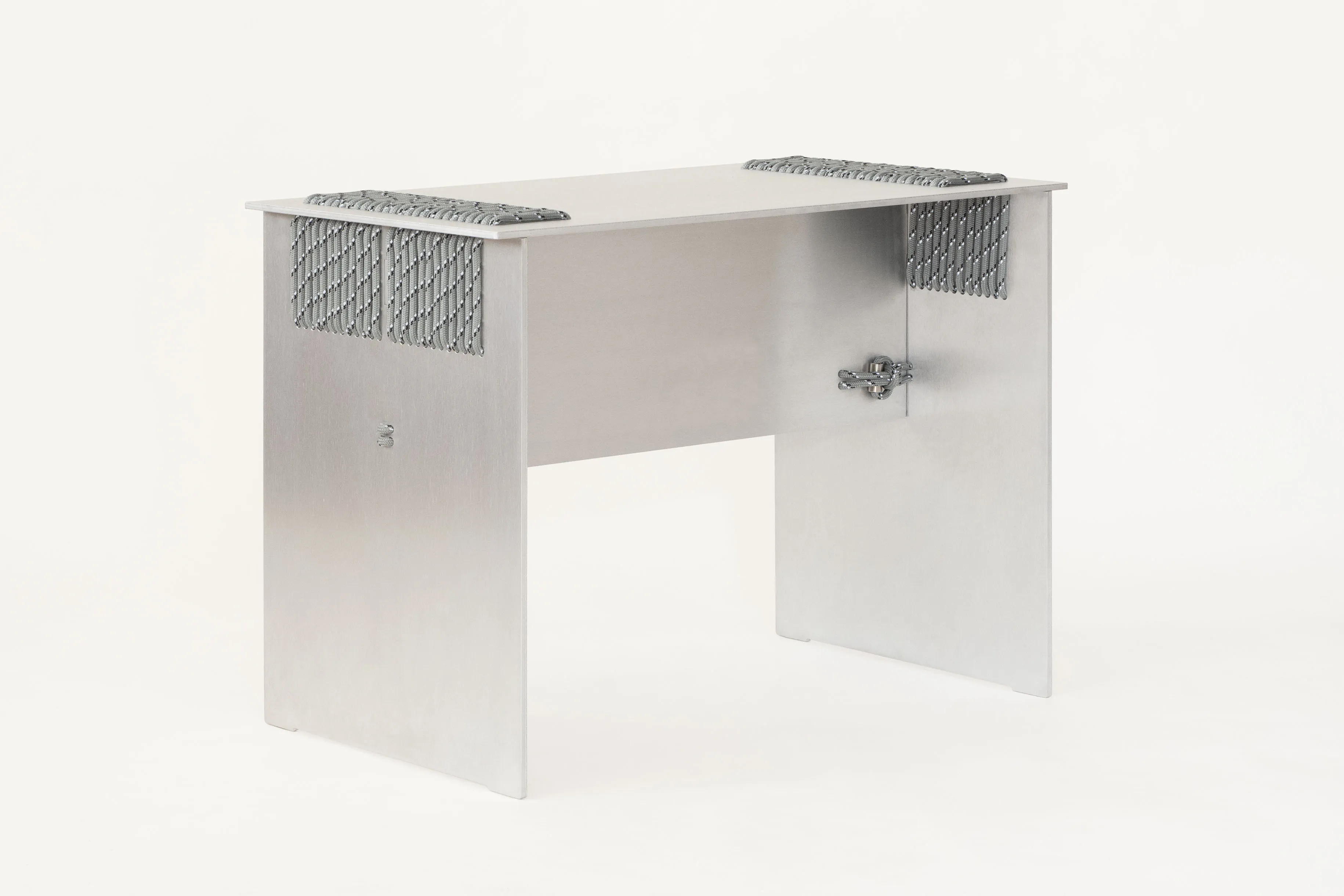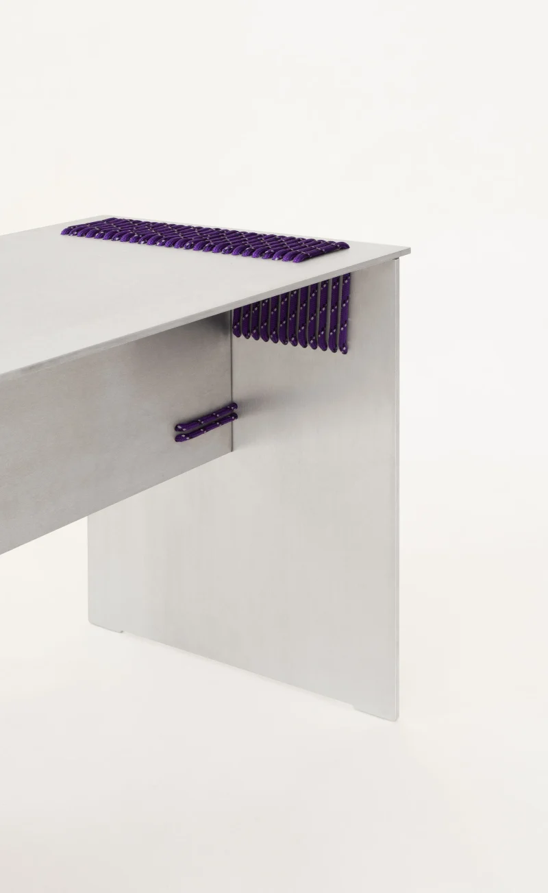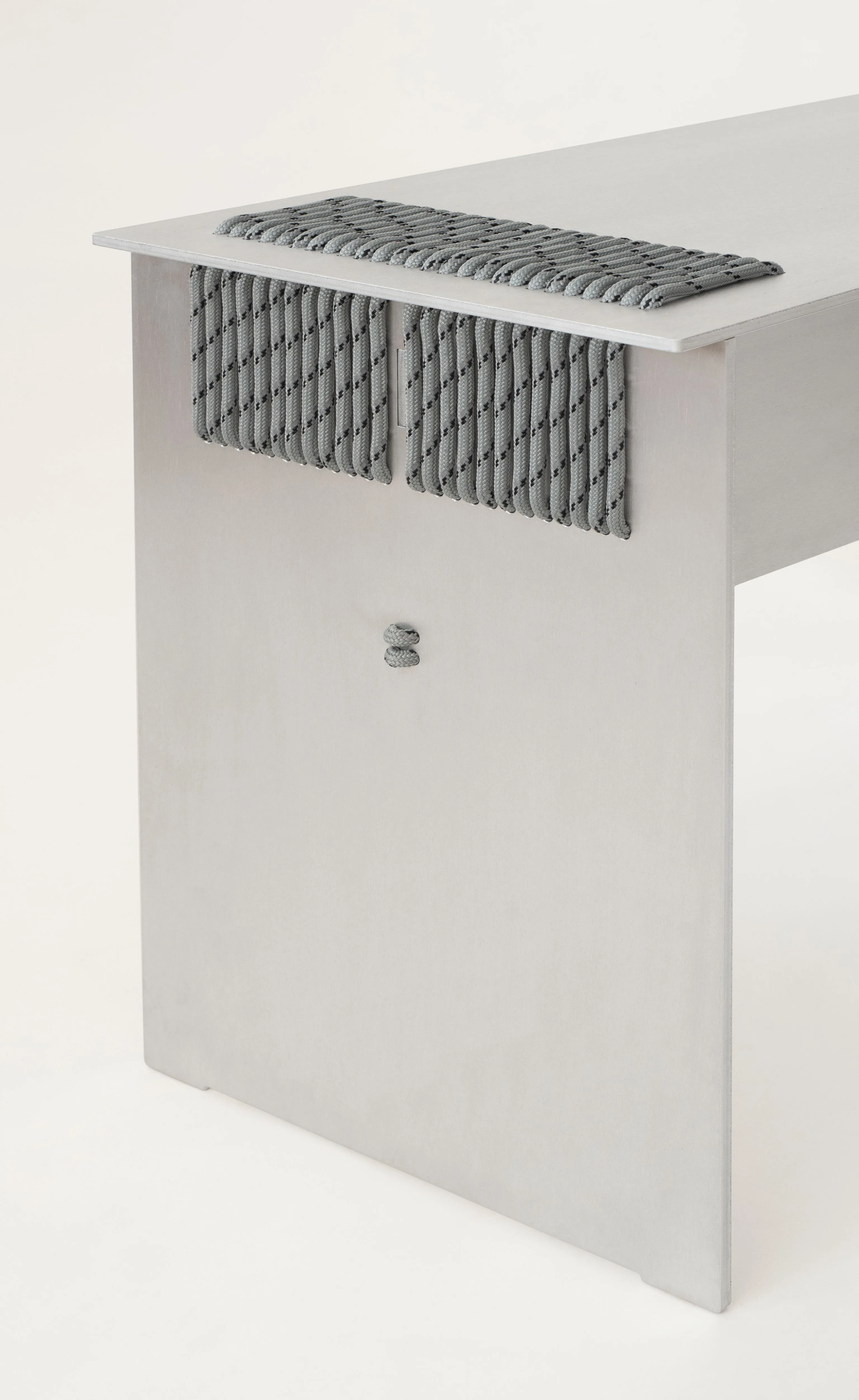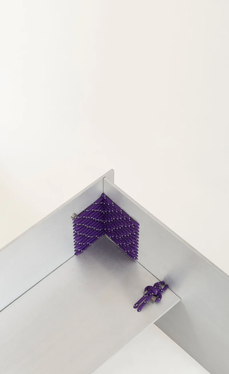 We intentionally chose aluminium, a perennial and adaptable material, to shift the focus onto the innovative assembly technique. This contrast highlights the structural role of the rope, allowing it to become the defining feature of the design.