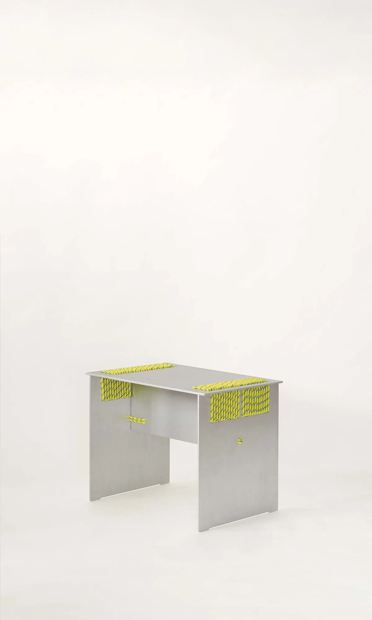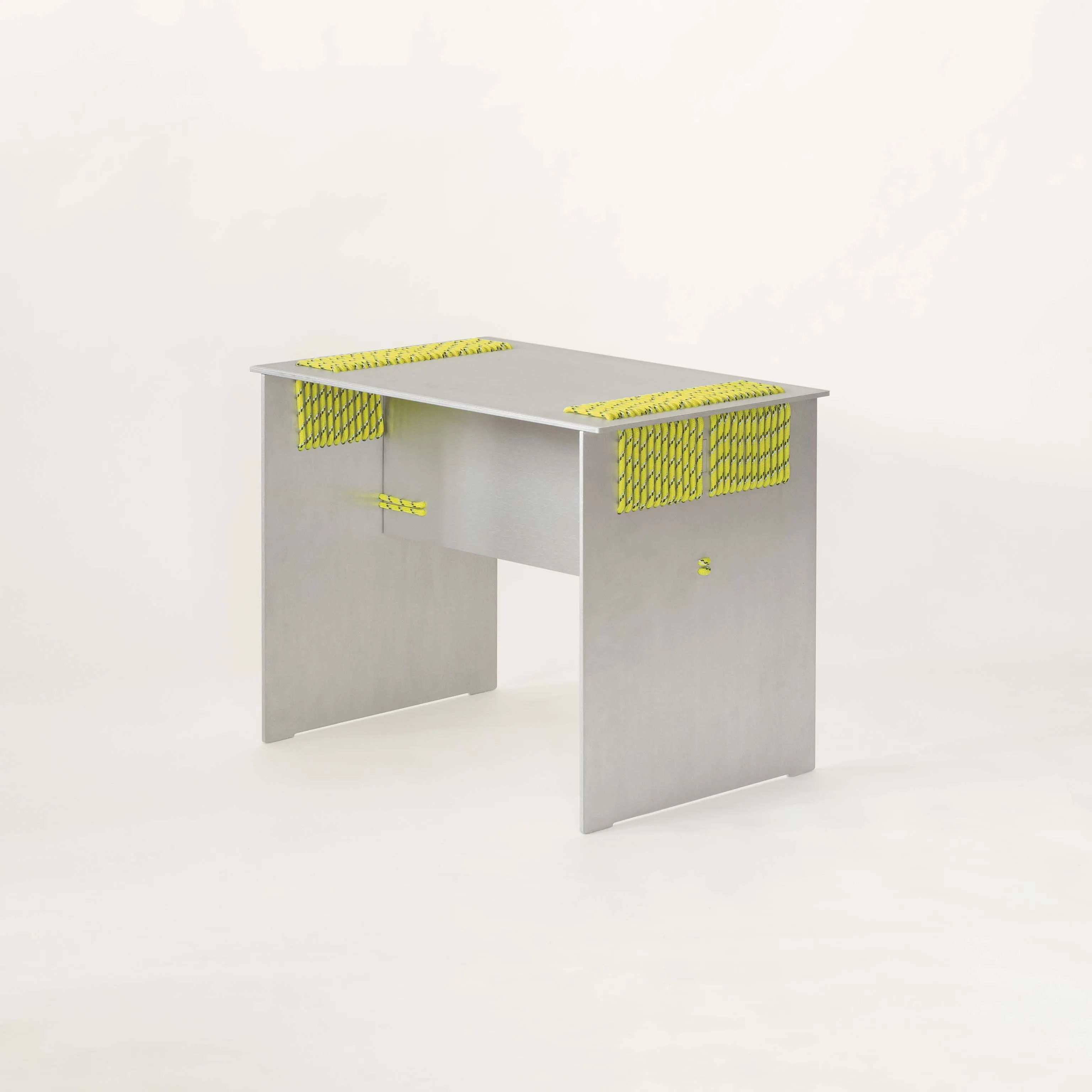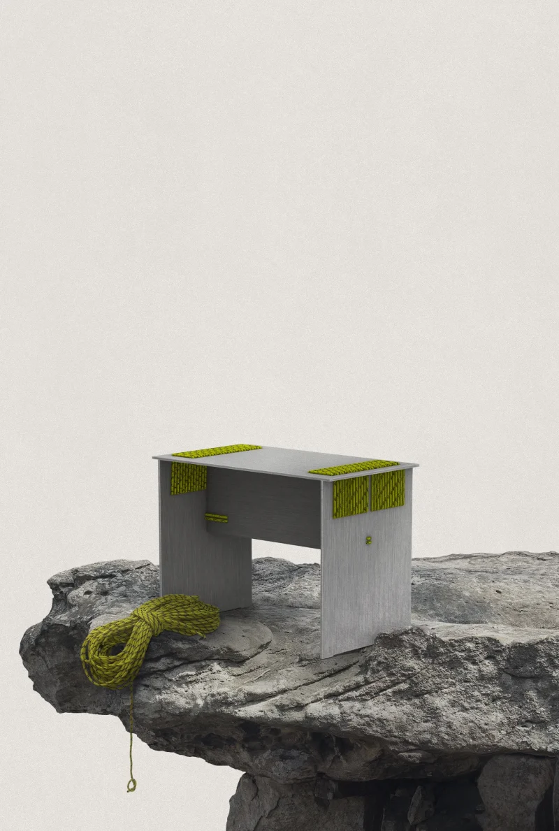 We intentionally chose aluminium, a perennial and adaptable material, to shift the focus onto the innovative assembly technique. This contrast highlights the structural role of the rope, allowing it to become the defining feature of the design.