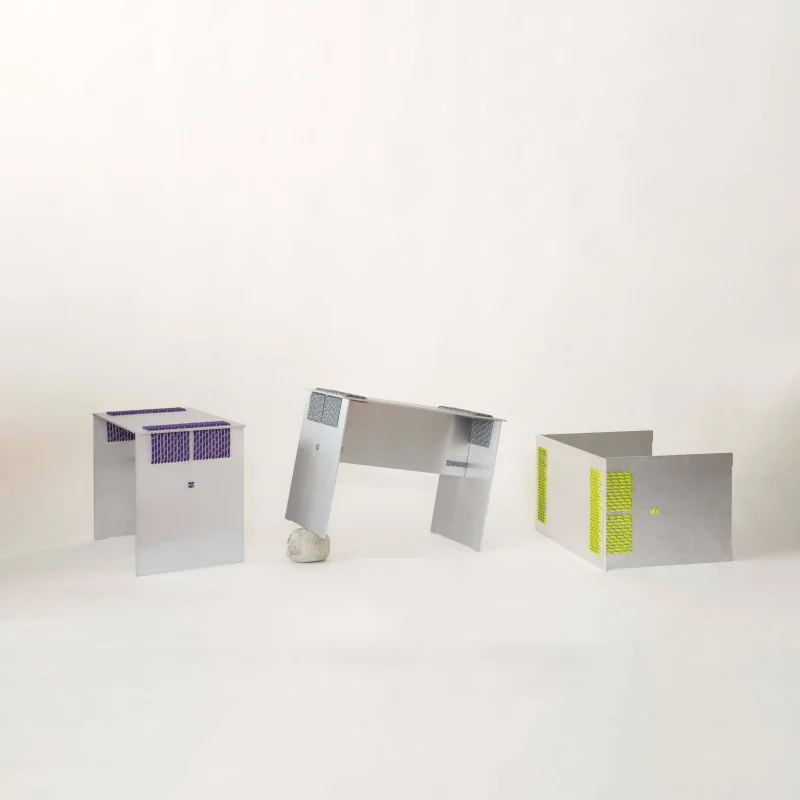 The stool combines laser-cut aluminium with precisely placed openings that guide the rope, ensuring both structural stability and a refined, modern aesthetic.
