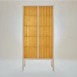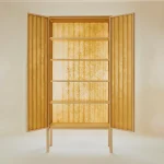 KÖNIGSWINTER is light, age-defying, contemporary architectural furniture. The cabinet rests, sublimely tall, on delicate maple stilts. Weather-brightened, corrugated panels: luminous, as if by magic. Translucent waves shimmer enigmatically, shell-like, a promise of protection. Continuously transforming in the room, with moods of changing light. Two softly closing doors open to the body. The slender frame and shelves precision made of local maple, hand-jointed according to old carpentry tradition.