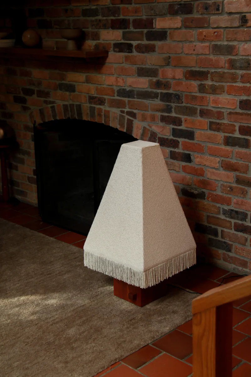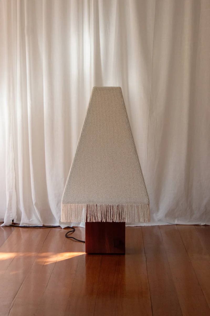 This lamp is a reference to Bulgarian costumes that are worn whilst performing traditional rituals to fend off evil spirits. Combining this with the warmth and charm of the art deco fringed lamps to serve as a playful expression of the classic floor lamp. It shares an ambient glow with an inbuilt timber knobbed dimmer.