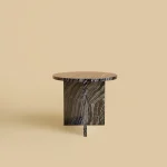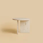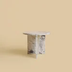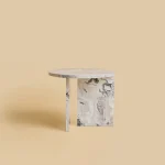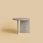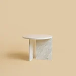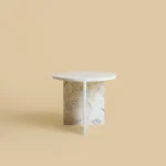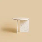 The Kyushu coffee table is made entirely of selected terrazzo or marble. The top is circular and 45cm in diameter, and the legs are made from two marble boards in which one part is interlocked on the top.