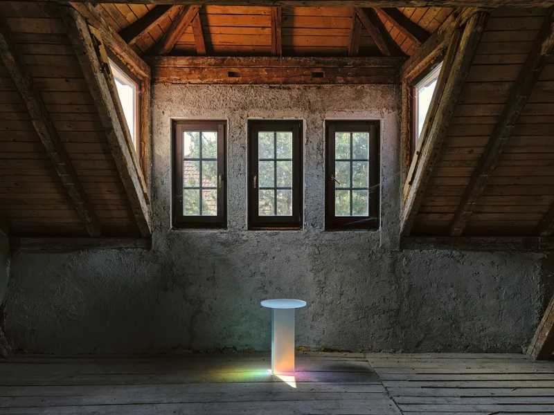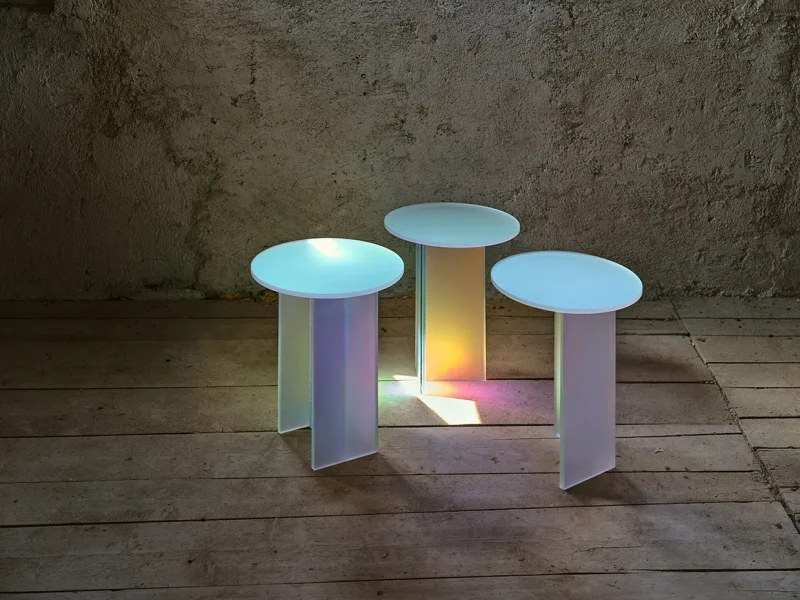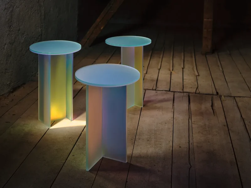 As an extension of the “Isola” collection, the tables are inspired by the undulating waves of the Adriatic Sea. Crafted from laminated dichroic glass, this coffee table possesses a unique quality—it transforms its surroundings with an ever-shifting kaleidoscope of colors, dancing in response to the play of light, particularly sunlight. The result is a mesmerizing display of varied light effects, infusing the space with a luminous vibrancy that is nothing short of enchanting.