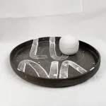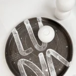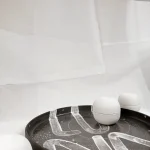 The White Lava collection by ccontinua + mamt recalls a moon landscape, where white porcelain lava flows overlap with fine line drawings, resembling cave paintings on the stone.