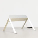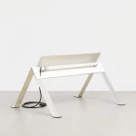 The L1 Low Floor Lamp is produced from 3 mm–thick aluminum sheets, laser-cut and bent. The two sheets interlock and are fastened with screws; as a result, the final form provides stability to the piece and creates flanges that direct the light.