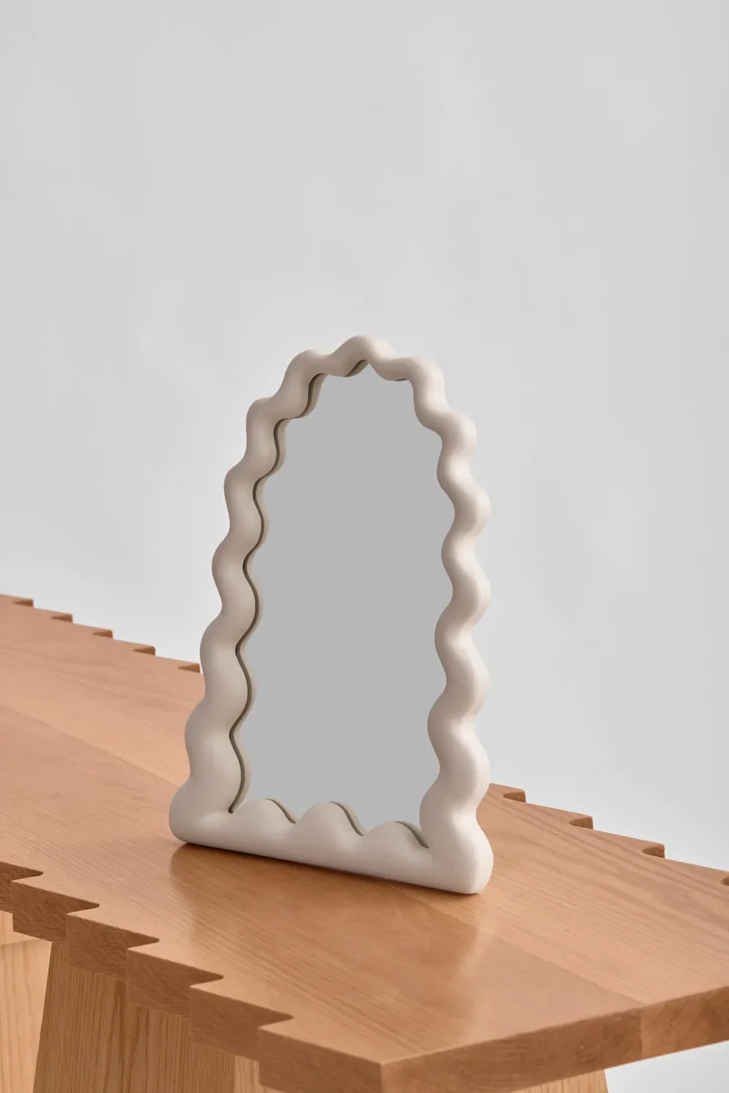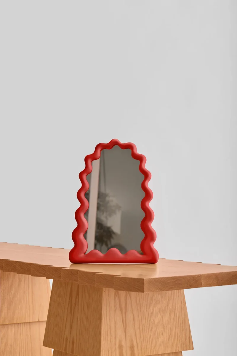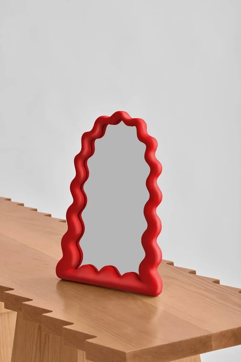 This mini mirror is a captivating rendition of the iconic full body “La Celebración” mirror, drawing inspiration from the world of unconventional and sensual kinetic forms. Crafted with meticulous attention to detail, it is constructed from fiberglass and finished with a semi-matte gel coat color that exudes sophistication. Each piece is lovingly handmade in Mexico, adding a touch of artisanal charm to your space.