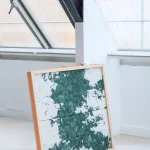 Un carré au coeur vert suspendu où le textile se fait pierre, illusion d’un marbre vivant. Le blanc et le vert s’entrelacent en nervures subtiles, comme sculptés par le temps et le hasard. Un tableau qui défie la matière, oscillant entre force et légèreté, entre l’éphémère du tissu et la pérennité de la roche qu’il évoque. Un trompe-l’œil minéral, un fragment de nature façonné par l’humain.