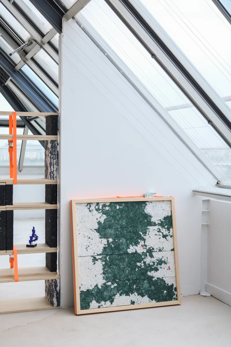A square with a green core suspended, where textile becomes stone, an illusion of living marble, by FabBRICK. White and green intertwine in subtle veins, as if sculpted by time and chance. A wall decor piece that challenges the material, balancing between strength and lightness, between the fleeting nature of fabric and the permanence of the rock it evokes. A mineral trompe-l’œil, a fragment of nature shaped by human hands.