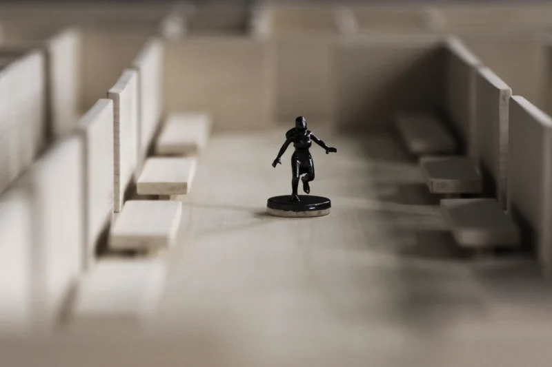 Benjamin Nordsmark created the Labyrinth Table to show how a well-known object like a table can be given an extra dimension by creating a small universe inside it. The labyrinth consists of several walls under a sheet of diamond glass, and inside of it, six characteristic figures can be moved around by handles underneath it. Most people possibly remember from childhood how they used to play with miniature figures in a small universe similar to the real world. And these nostalgic feelings are the ones that the table should generate in people’s minds and encourage them to explore and go deeper into the story of the labyrinth. The table was built up with a central core in steel to make it strong enough to last for decades and was later covered with 5 mm. of massive maple wood. A nice thing about this detail is that the handles stick to all the surfaces on the table because of the magnetism.