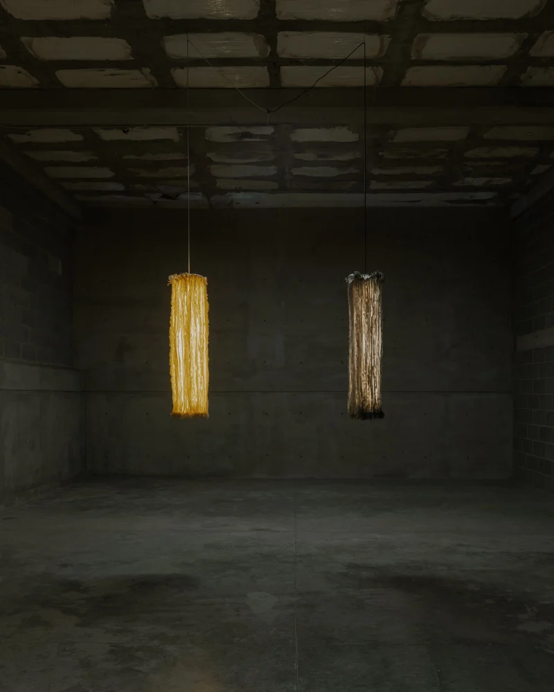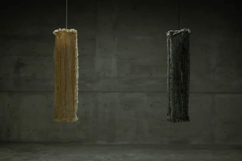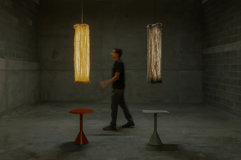 The lamp is available in two editions: Natural, with a honey-toned hue that reflects the material’s origin, and Humo, a dyed darker variation. In both versions, each lamp is singular and cannot be replicated. As bacteria grow, it forms cellulose sheets with patterns that are never identical. Subtle shifts in texture, density, and tone emerge naturally. These variations are signatures, giving every lamp its own character.