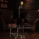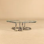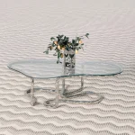 The transparent glass top serves as a quiet counterpoint, offering clarity while granting full visibility to the sculptural base beneath. Minimal in form and free of visual weight, it allows the looping structure to become the focal point, an expressive anchor that energises the setting without overwhelming it. The resulting composition is one of balance: motion and stillness, transparency and solidity, gesture and structure.