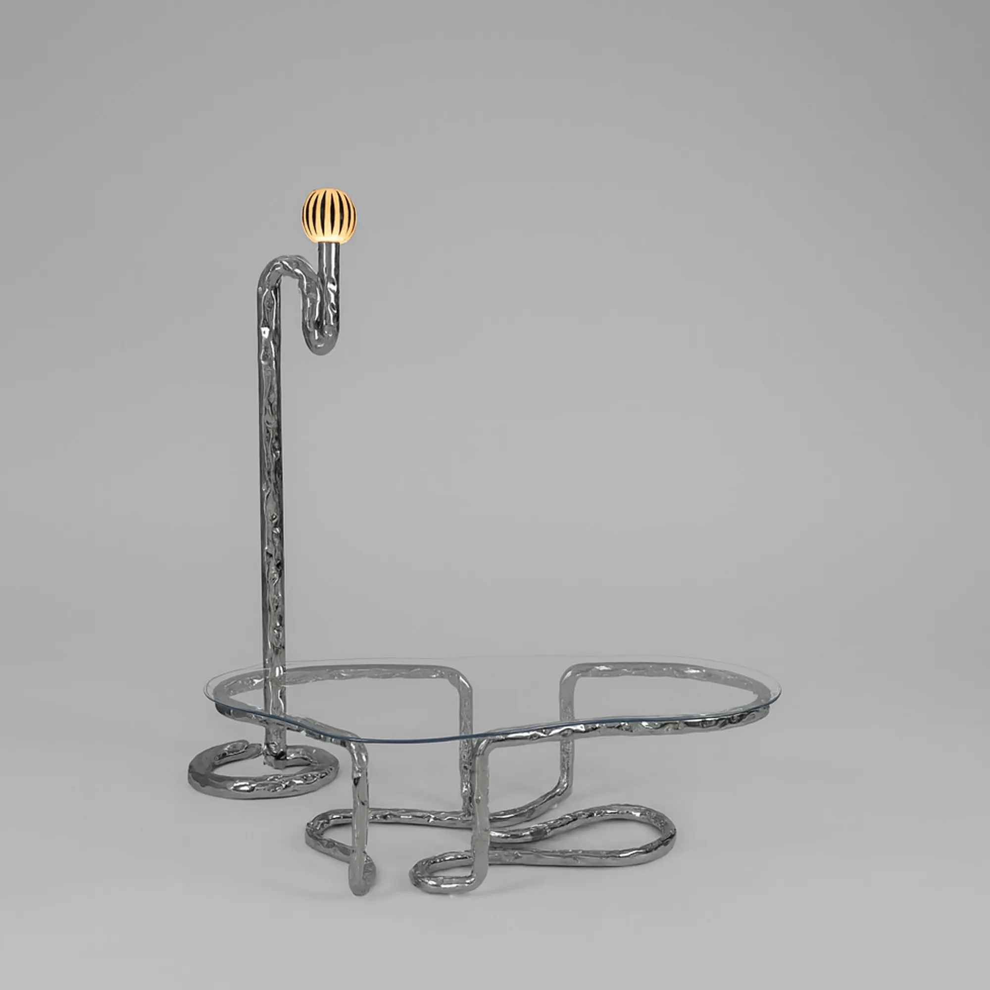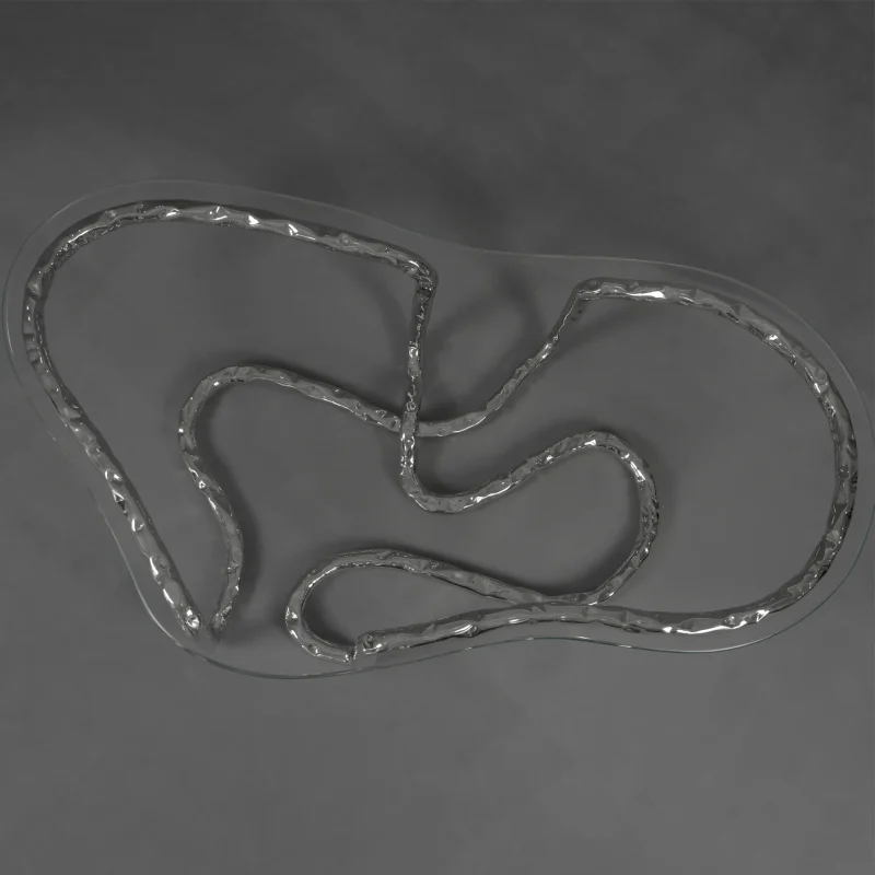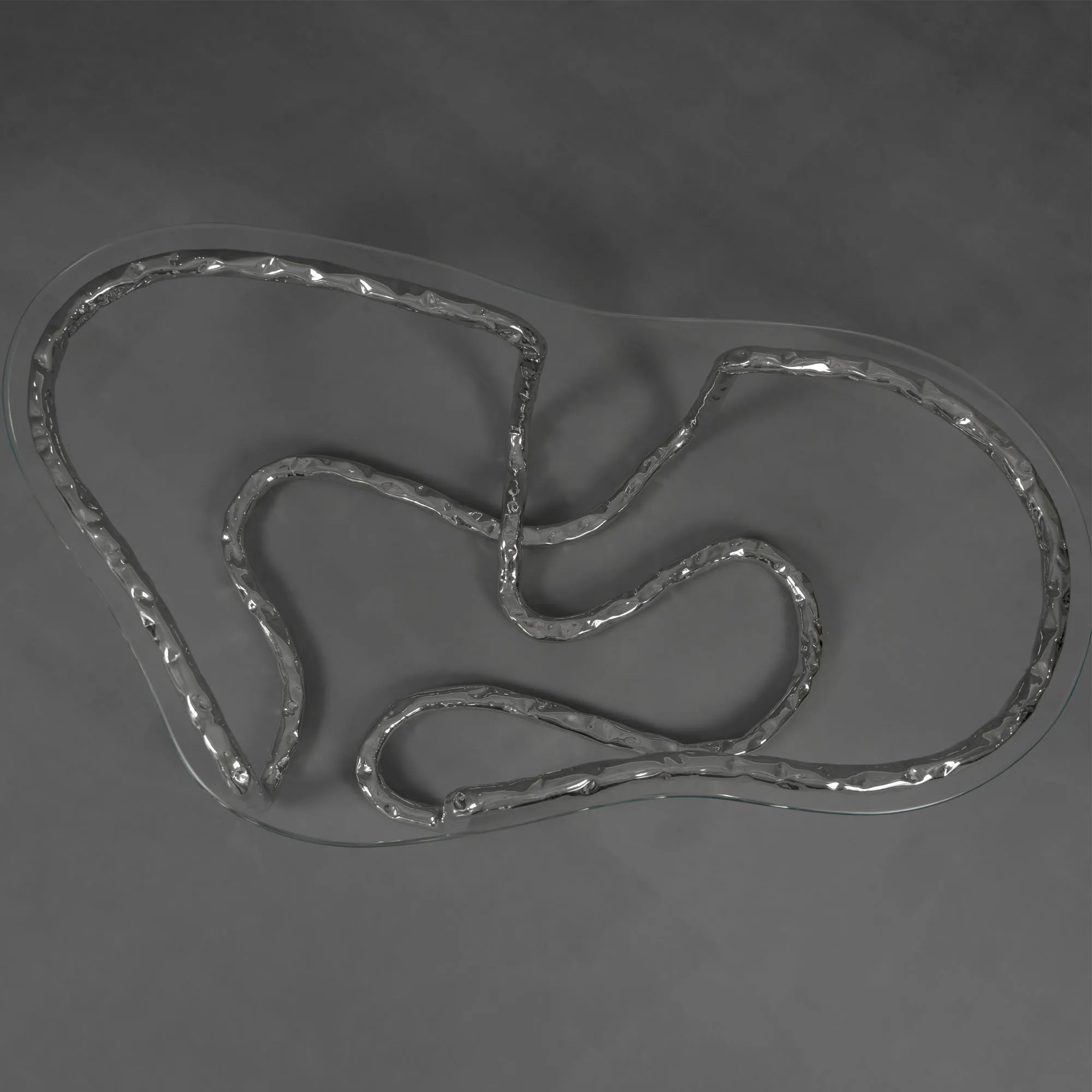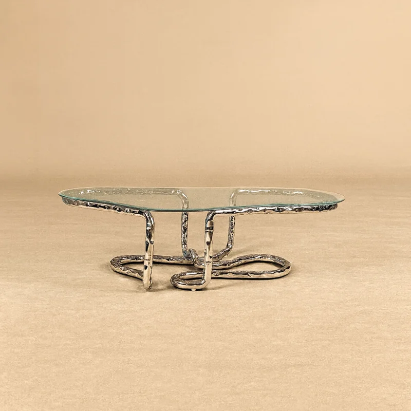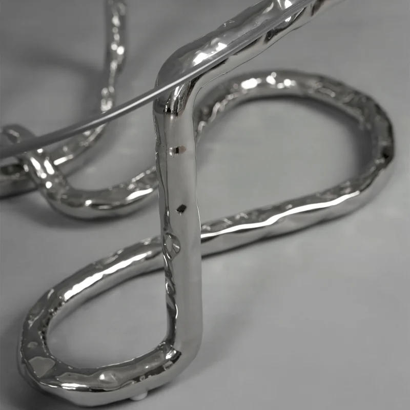 The transparent glass top serves as a quiet counterpoint, offering clarity while granting full visibility to the sculptural base beneath. Minimal in form and free of visual weight, it allows the looping structure to become the focal point, an expressive anchor that energises the setting without overwhelming it. The resulting composition is one of balance: motion and stillness, transparency and solidity, gesture and structure.