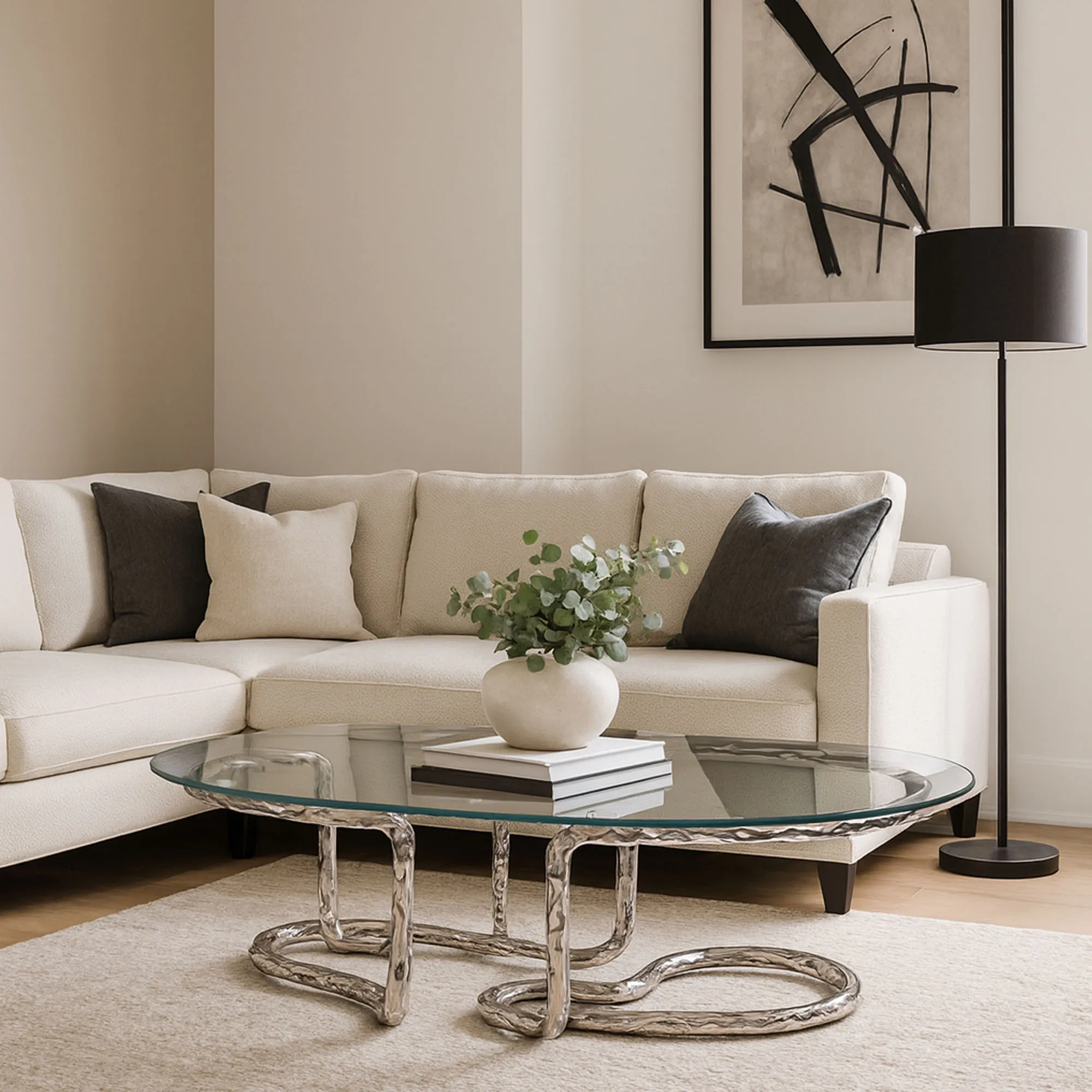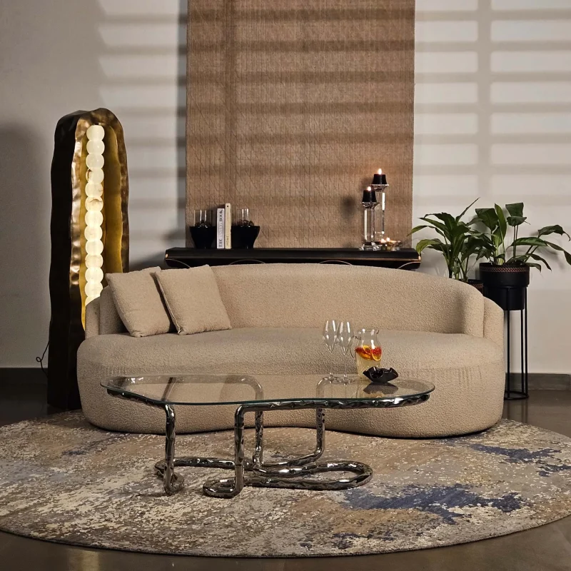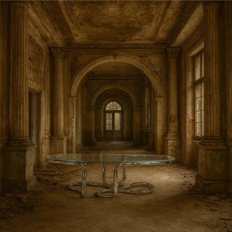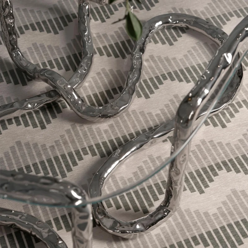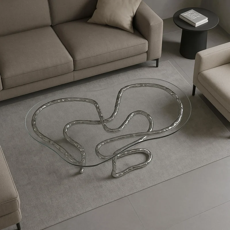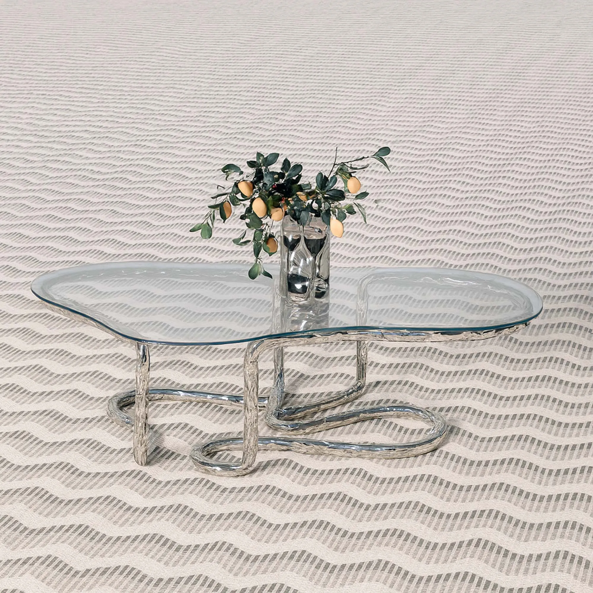 The transparent glass top serves as a quiet counterpoint, offering clarity while granting full visibility to the sculptural base beneath. Minimal in form and free of visual weight, it allows the looping structure to become the focal point, an expressive anchor that energises the setting without overwhelming it. The resulting composition is one of balance: motion and stillness, transparency and solidity, gesture and structure.