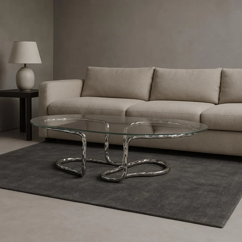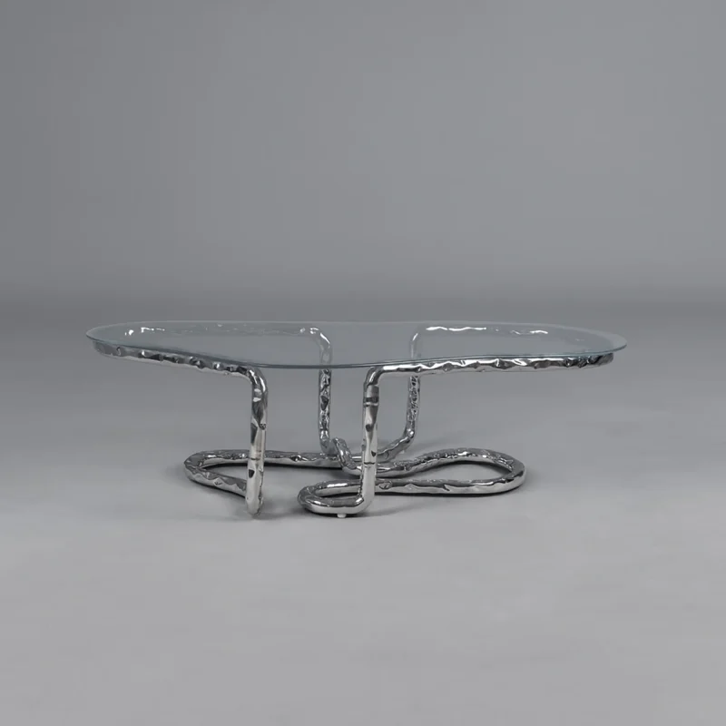 The Lasso Coffee Table captures a moment of suspended motion: a polished stainless-steel base that twists, loops, and curves like a rope caught mid-unfurling. Formed through hundreds of precise cuts and slow, deliberate bending, the metal is shaped into a continuous gesture that freezes movement in space. Its surface is then hand-hammered into the signature Nitush-Aroosh undulating texture, giving the steel a lively, shifting quality that catches and breaks light across its contours. What appears fluid is in fact resilient; what seems effortless is the result of patience, experimentation, and control over one of the most uncompromising materials.
