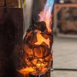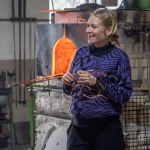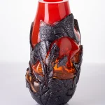 The glass blown red-orange Lava vases by Anna Jožová are a development in color and dimension of the approach taken by the artist in the Keto series. They combine two layers of glass and copper wire, where the flow of enamel through the modeled copper wire gives the shape of the vase a dynamic appearance. Thematically, this series is again based on the eventuality of extinction caused by a natural disaster. The natural process of a volcanic eruption inspires the appearance of the vases. Also, it refers, among other things, to the folly of the inhabitants of Pompeii, which its inhabitants proudly built near a volcano.