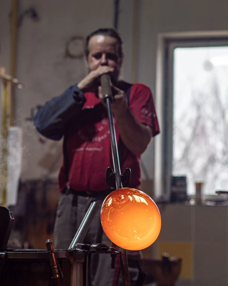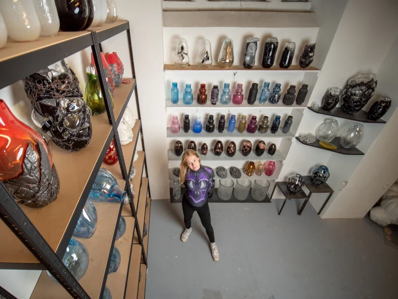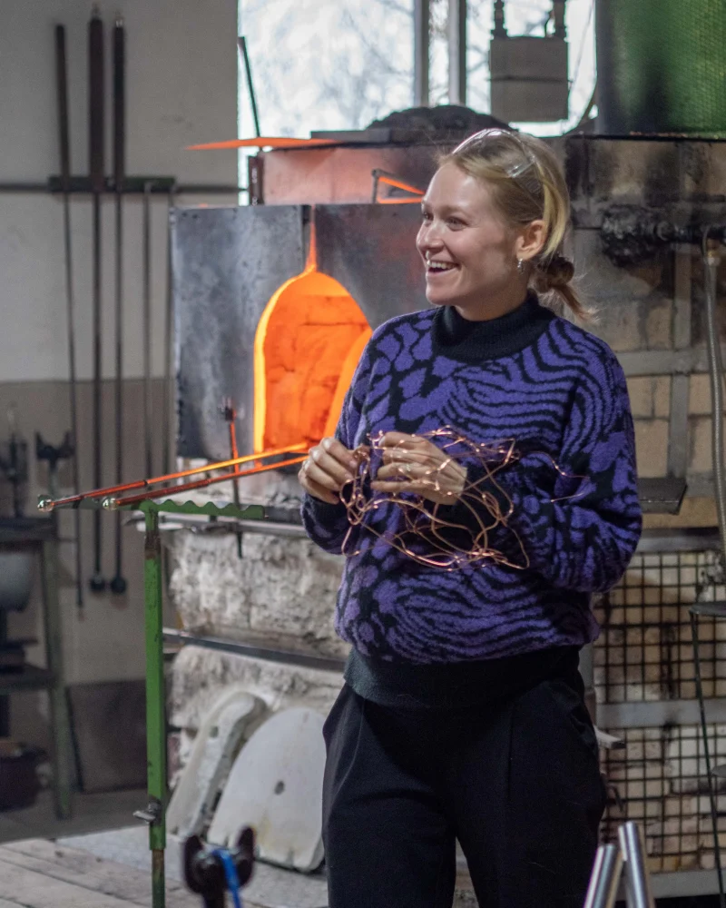 Anna Jožová (*1996) is a Czech artist and designer who works with glass on the border between free art and design. In 2023 she graduated from the Master's programme at the Glass Studio under the supervision of Professor Rony Plesl at the Academy of Arts and Crafts in Prague. Between 2016 and 2017, she studied in the Ceramic Design Studio under Antonín Tomášek at the Faculty of Art and Design at Jan Evangelista Purkyně University in Ústí nad Labem. Anna has been studying ceramics and porcelain since her studies at the Václav Hollar Secondary School of Art. Since 2018, she has presented her work in many collective exhibitions, fairs and art projects, e.g. at London Design Week, Venice Design Biennial, Czech Grand Design, Glassfest Karlovy Vary, etc., as well as in a solo show at the Kvalitář gallery in Prague. Apart from his own work, he also collaborates with designer Vlastimil Šenkýř, with whom he forms an artistic duo under the name Kombo. He has been consistently working on his own glass creation and design, combining different, at first sight disparate materials and classical glass techniques to create new unique objects. To understand Anna Jožová's work, it is essential that she does not work only formally and is not only focused on the visual effect of the work. On the contrary, she always carefully considers and chooses the form based on a given concept based on her natural interest in the surrounding world. This is also linked to a desire to explore and push the boundaries of glass as a creative material and to push its technical possibilities. Experimentation is therefore one of the most important approaches in Anna Jožová's work, thanks to which she finds new ways of working with glass. Combined with the conceptual background of most of her projects, this results in works that are design objects, but the way the artist creates and reflects on them moves them into the realm of free art. Since 2018, Anna Jožová has been creating a series of original vases, always responding to a currently explored theme. Some of these series are therefore partly related to each other, thus shifting the artistic and technological approach to new positions. Her most important creative theme so far is a reflection on the impact of human intervention on the environment, which she addresses, for example, in the Gaia, Keto and Nava series. At the same time, Anna Jožová's work is able to look back with a certain amount of humour at some moments of our everyday life (the Coquettes series, the Lisa vase, Hangover) and in some cases her work is almost a philosophical meditation on the existence of man and his connection to a certain time and place (the Kairo series, Chrono)