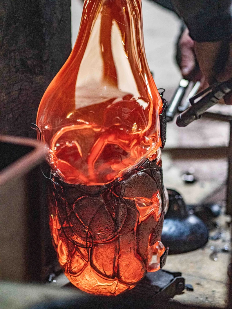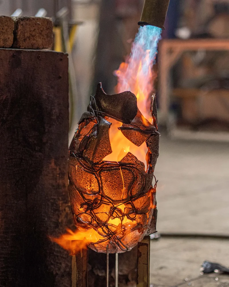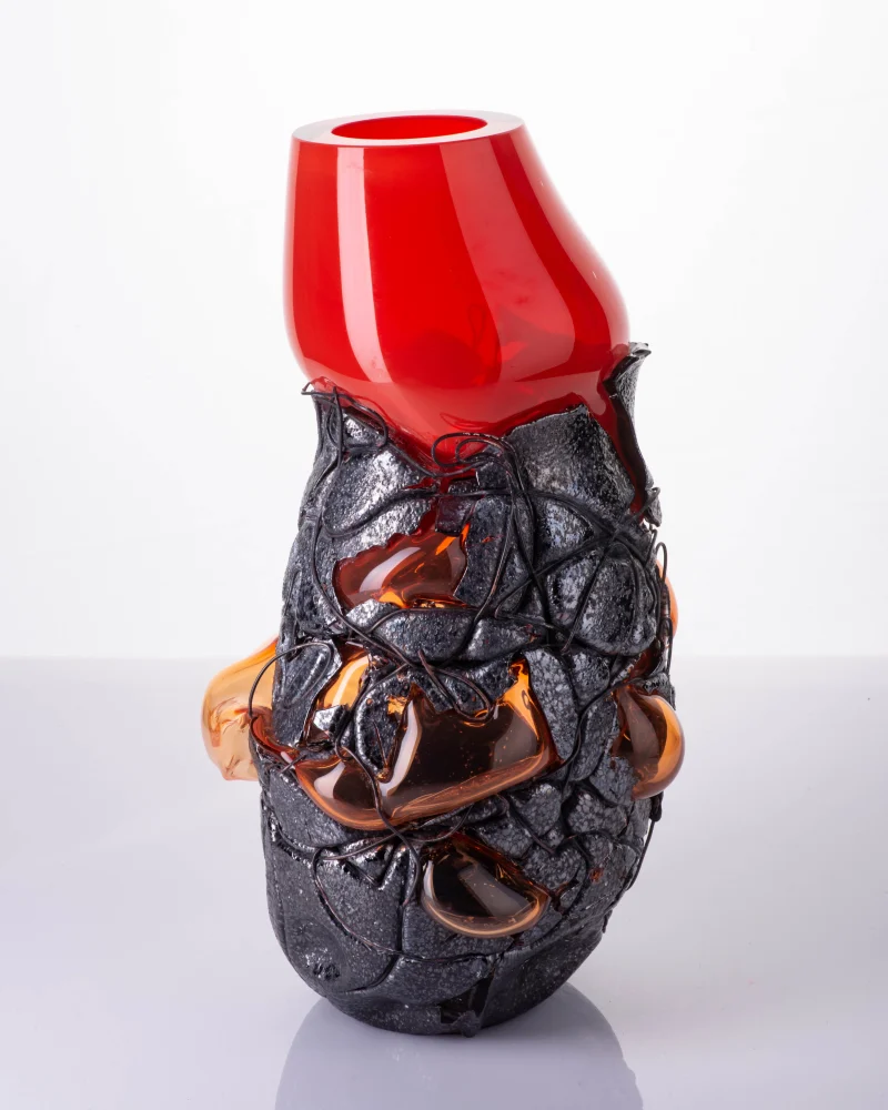 The glass blown red-orange Lava vases by Anna Jožová are a development in color and dimension of the approach taken by the artist in the Keto series. They combine two layers of glass and copper wire, where the flow of enamel through the modeled copper wire gives the shape of the vase a dynamic appearance. Thematically, this series is again based on the eventuality of extinction caused by a natural disaster. The natural process of a volcanic eruption inspires the appearance of the vases. Also, it refers, among other things, to the folly of the inhabitants of Pompeii, which its inhabitants proudly built near a volcano.