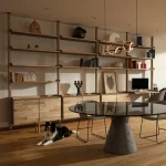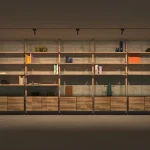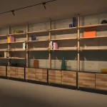 Each column is composed of two vertical elements, three shelves, and one closed storage, each of these elements can be moved around as needed to make every piece unique as you desire.