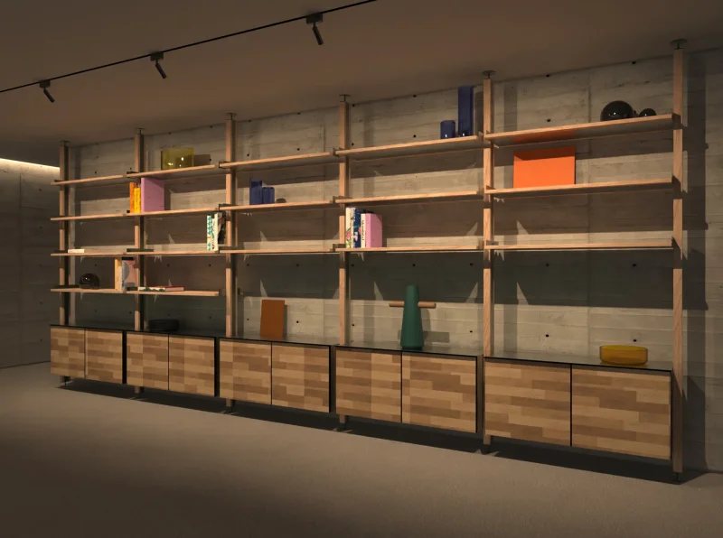 Each column is composed of two vertical elements, three shelves, and one closed storage, each of these elements can be moved around as needed to make every piece unique as you desire.