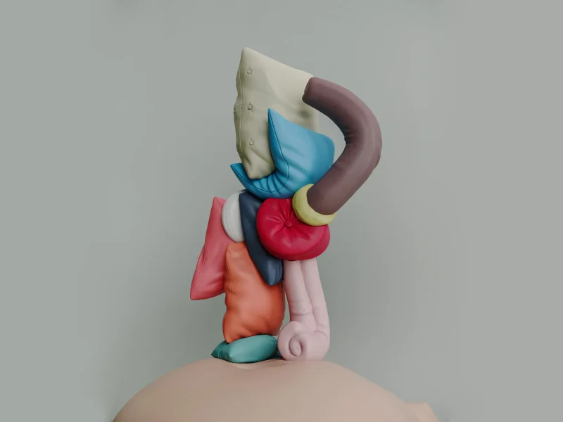 Lazy Wolly is a 35-centimeter pillow character. The main materials are plastic, molded plastic, metal, acrylic. Each element is a pillow, or a soft blanket in the guise of body parts.