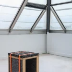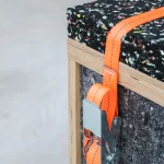 One of FabBRICK’s signature seats made of upcycled textile, reimagined in shades of grey and black—a dark composition that highlights the light wood. The strap, precise and assertive, holds the materials together while creating a structure that is both stronger and more comfortable. This contrast of colors—between the depth of grey and the lightness of wood—creates a striking visual balance.