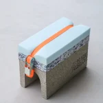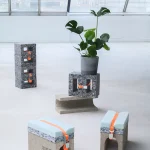 Du béton, une brique en textile revalorisé et une matière souple, presque élastique, se rencontrent dans une composition audacieuse. La solidité du béton s’équilibre avec la douceur de la mousse, le tout étant souligné par notre textile bleu azur revalorisé.