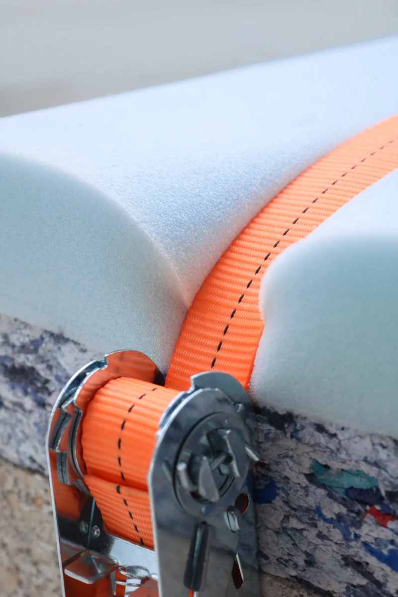 Cette pièce, à la fois sculpture et assise, incarne la rencontre de la robustesse et du confort. La sangle, visible et affirmée, retient l’ensemble avec justesse, tout en mettant en lumière la dualité des matériaux : l’un brut, l’autre doux.