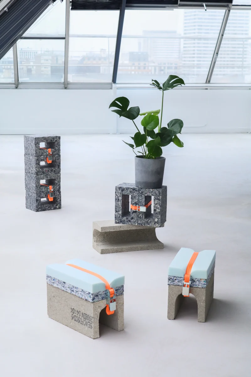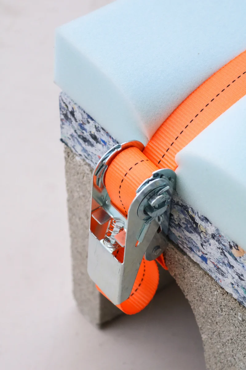 Du béton, une brique en textile revalorisé et une matière souple, presque élastique, se rencontrent dans une composition audacieuse. La solidité du béton s’équilibre avec la douceur de la mousse, le tout étant souligné par notre textile bleu azur revalorisé.
