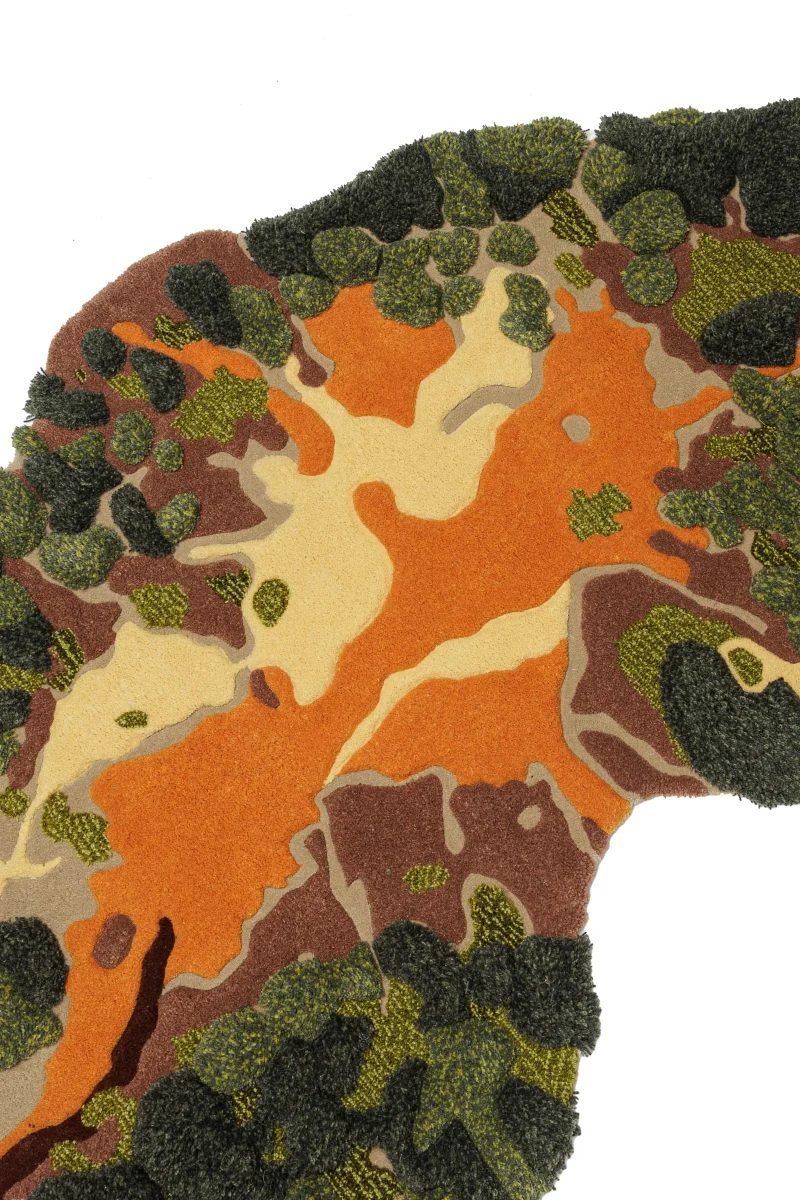 This tufted limited edition rug is crafted from 100% wool, offering both durability and textured surface. The intricately detailed design is accented with landscape-inspired forms and organic patterns, giving it a 3D look that fits seamlessly into any interior. Featuring rich tones of orange, red, yellow, and different shades of green, this rug creates a stunning focal point while adding warmth and playfulness to your home. Its durable construction ensures longevity. Crafted in Lithuania by the designer herself, the rug is a unique masterpiece that is one of a kind. This piece brings a touch of timeless sophistication to any living space.