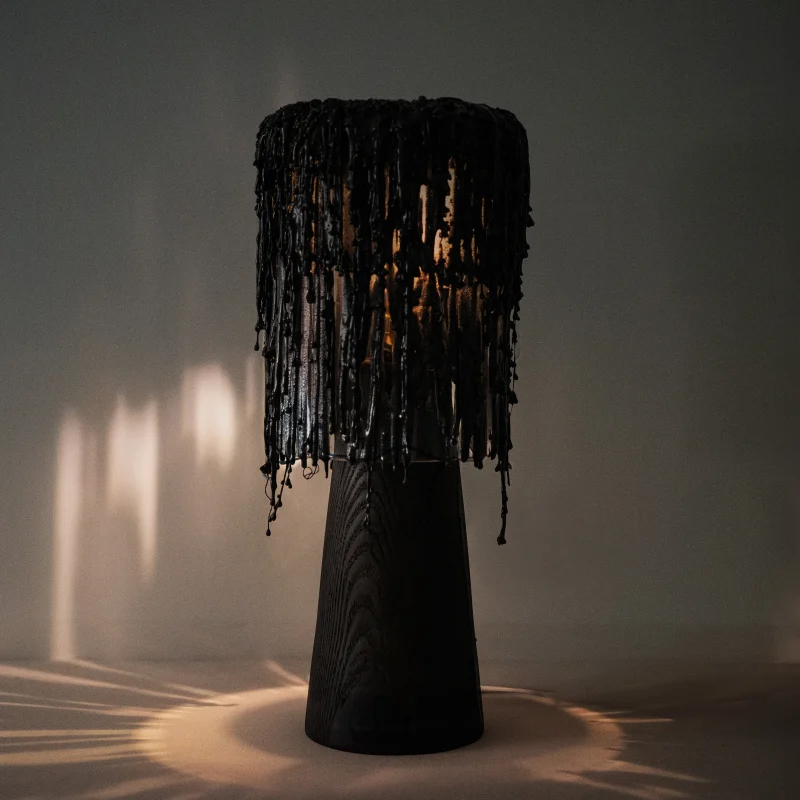 Leaky Lamp III by Pablo Ejarque-González embodies the unpredictable beauty of creation, exploring the interplay of translucency, transformation, and raw materiality. Crafted from graphite biomaterial, glass, and charred ash, the lamp blurs the boundary between the grotesque and the sublime, challenging perceptions of fragility and strength.