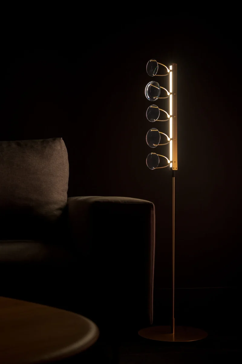 The collection began as a tangible convergence of inspiration, drawing upon Eindhoven’s (NL) history of lighting innovation, New Objectivity architecture, and the detailing of contemporary luxury optics, to form a suspended light-based artwork. The installation has been distilled to a collection of floor and desk lamps suitable for residential spaces.