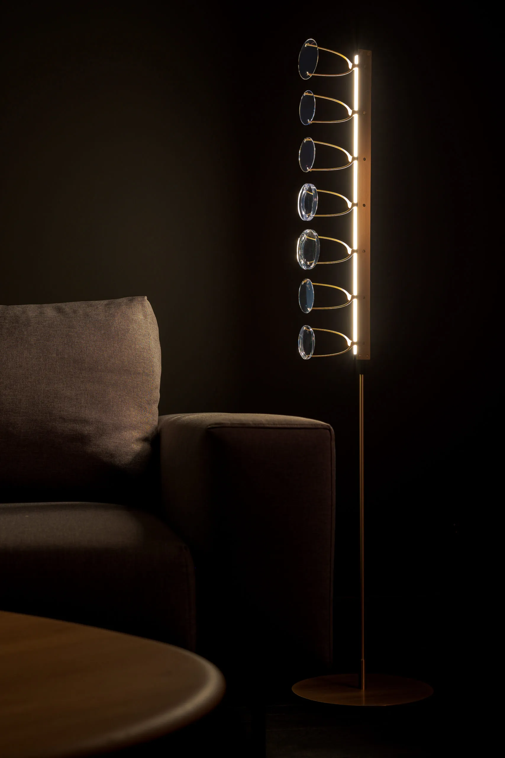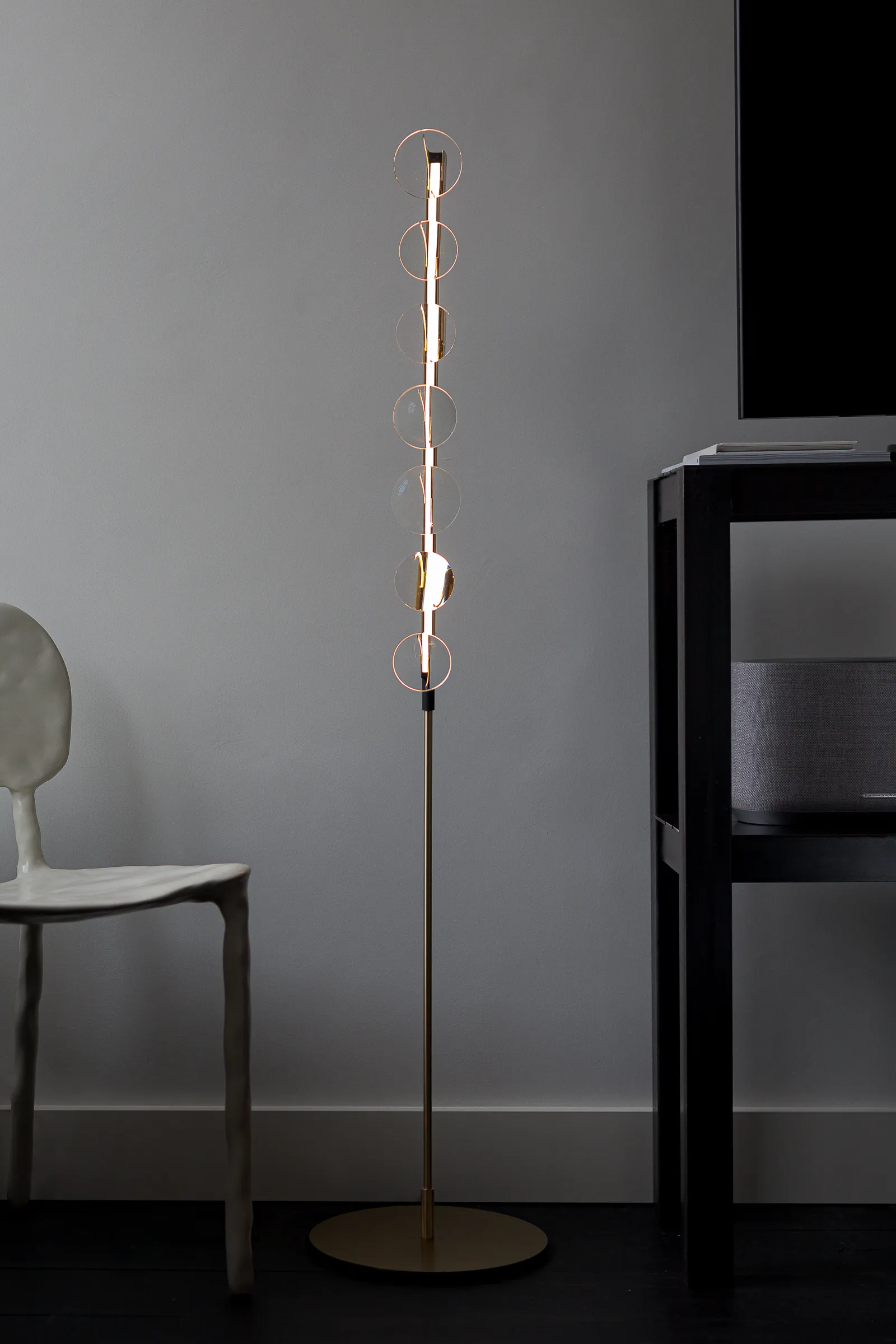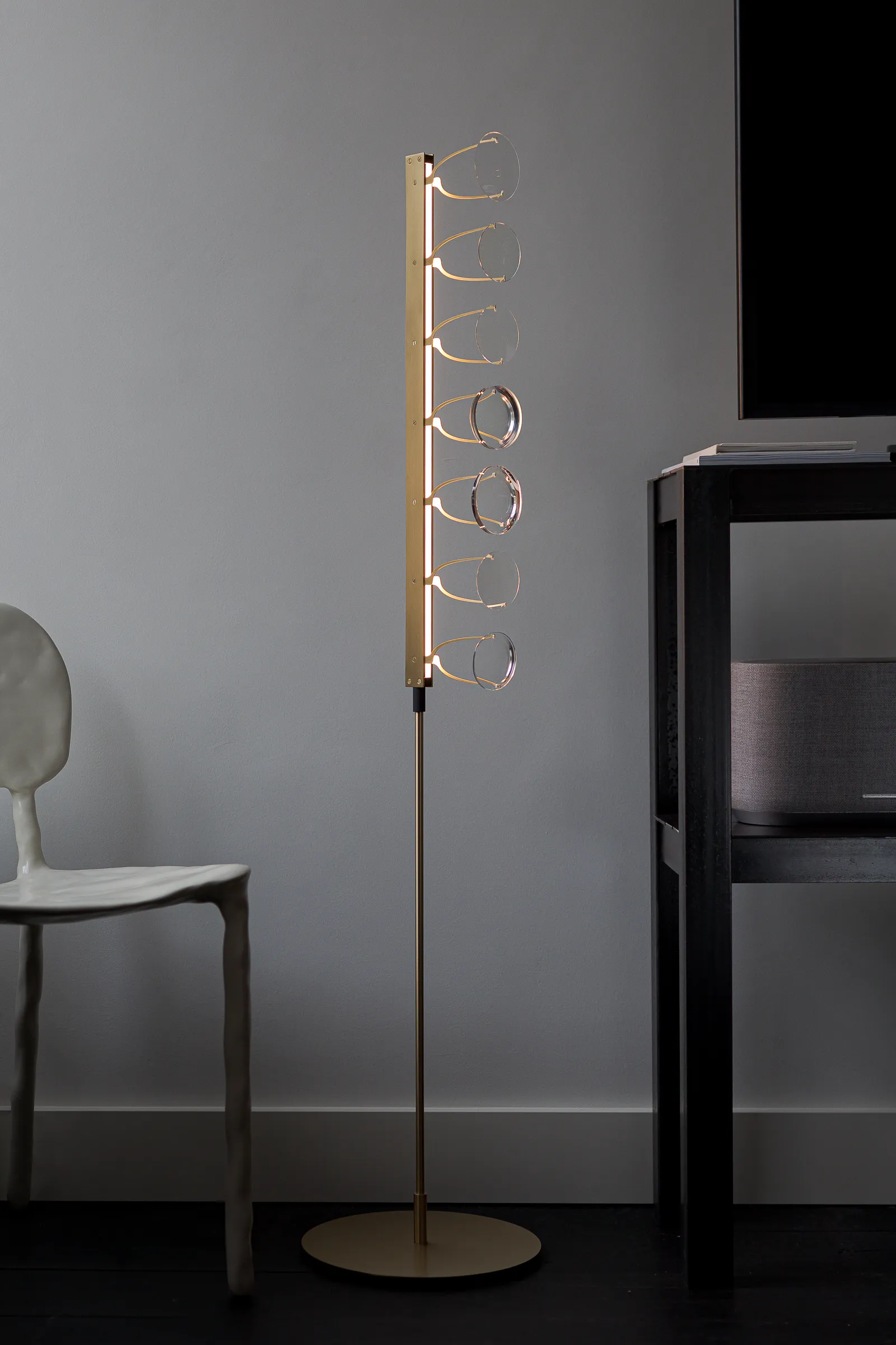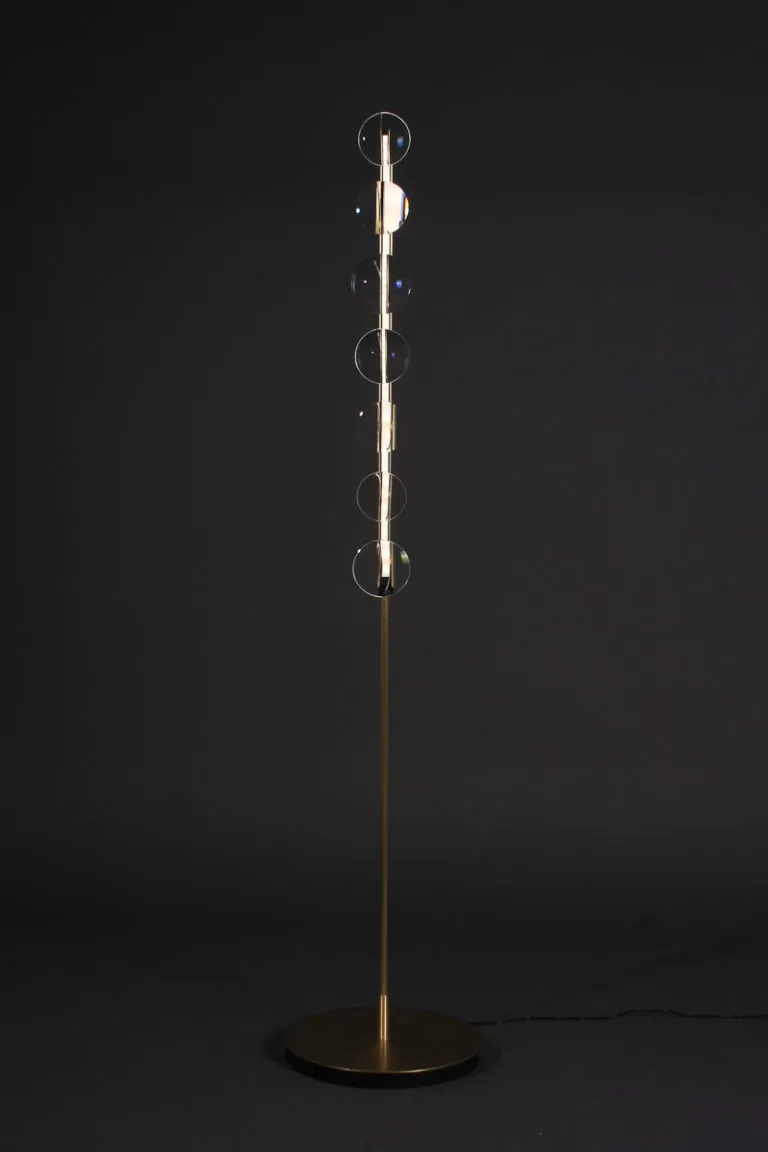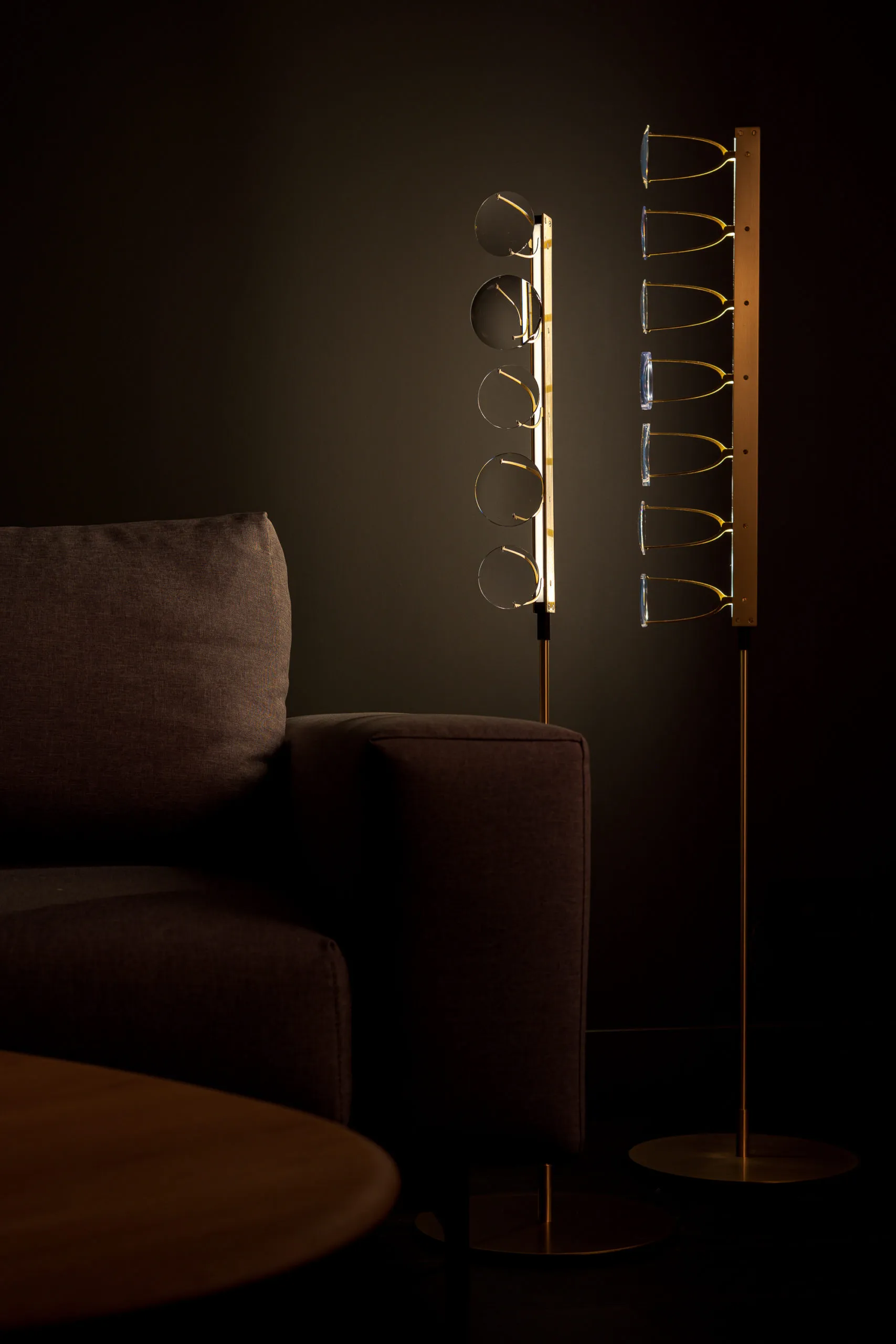 The collection began as a tangible convergence of inspiration, drawing upon Eindhoven’s (NL) history of lighting innovation, New Objectivity architecture, and the detailing of contemporary luxury optics, to form a suspended light-based artwork. The installation has been distilled to a collection of floor and desk lamps suitable for residential spaces.