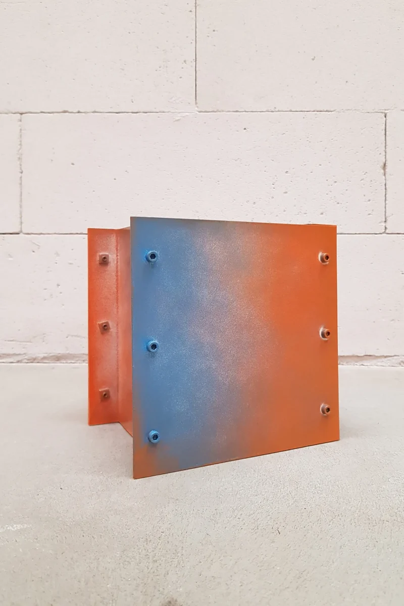Form wise, the pieces rejoice in the aesthetics of the building load – bearing systems. Like a building system, they propose a bearer/carrier where plants can reside and become a living architectural element. Taking reference from biophilic design, the “LIFE CABIN” builds on the idea of accommodating plant life-forms in contemporary interiors. A joint system was developed especially for the pieces’ surface connections. The process of painting the surfaces was an experimental and performative one; it was ideated and accomplished uniquely for every piece in the dye house using a powder-coating technique.