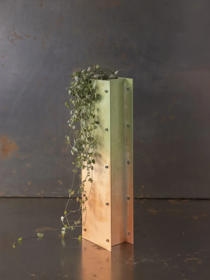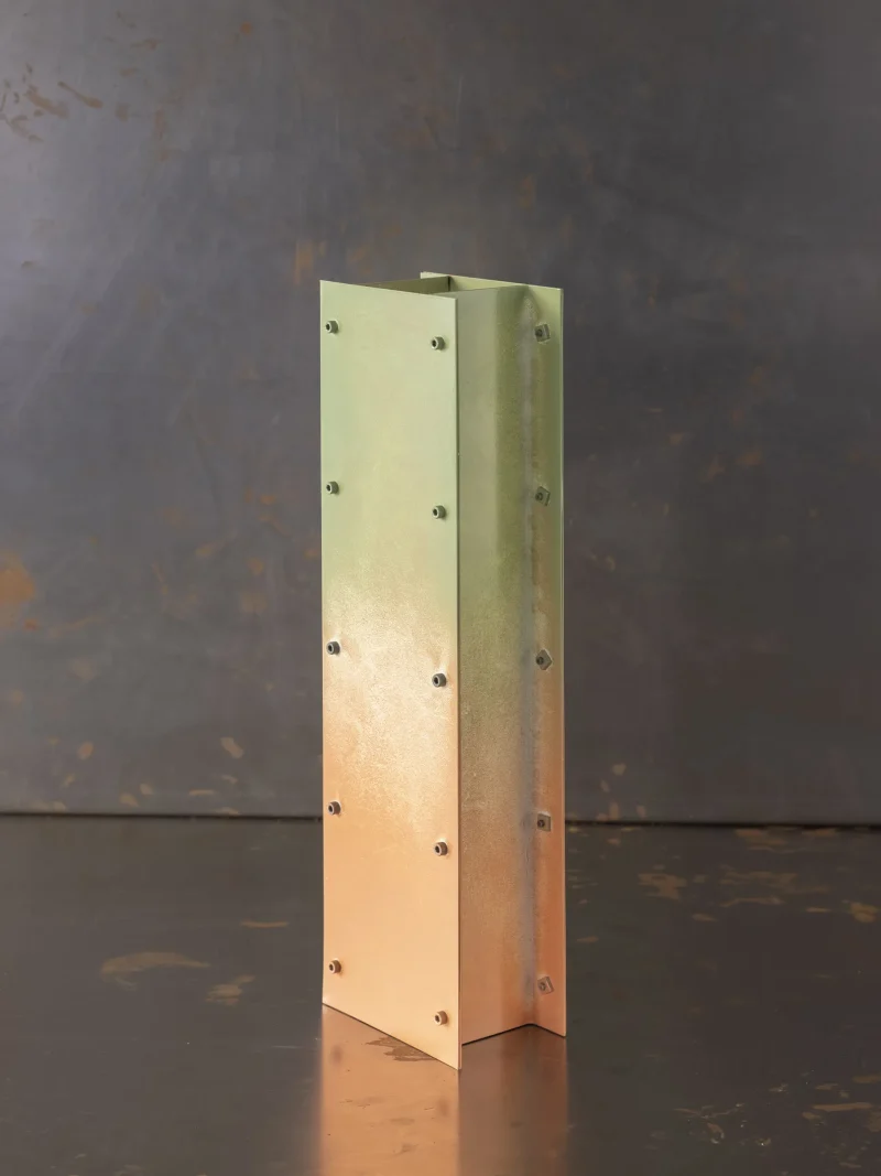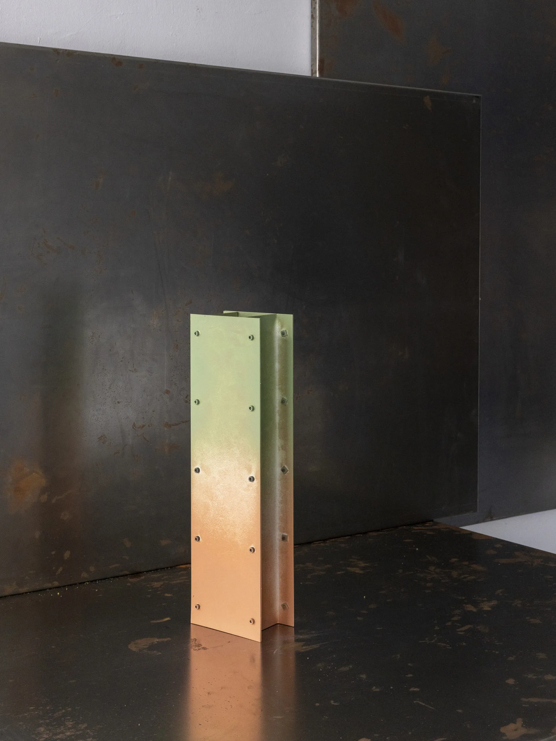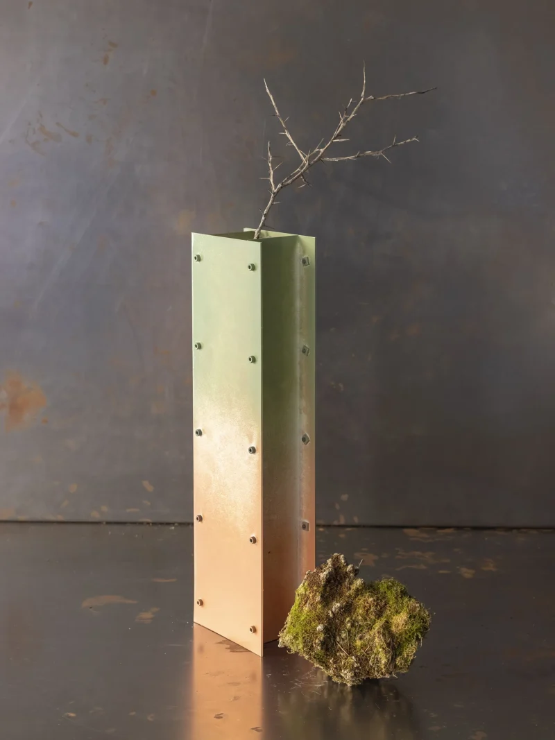 Form wise, the pieces rejoice in the aesthetics of the building load – bearing systems. Like a building system, they propose a bearer/carrier where plants can reside and become a living architectural element. Taking reference from biophilic design, the “LIFE CABIN” builds on the idea of accommodating plant life-forms in contemporary interiors. A joint system was developed especially for the pieces’ surface connections. The process of painting the surfaces was an experimental and performative one; it was ideated and accomplished uniquely for every piece in the dye house using a powder-coating technique.