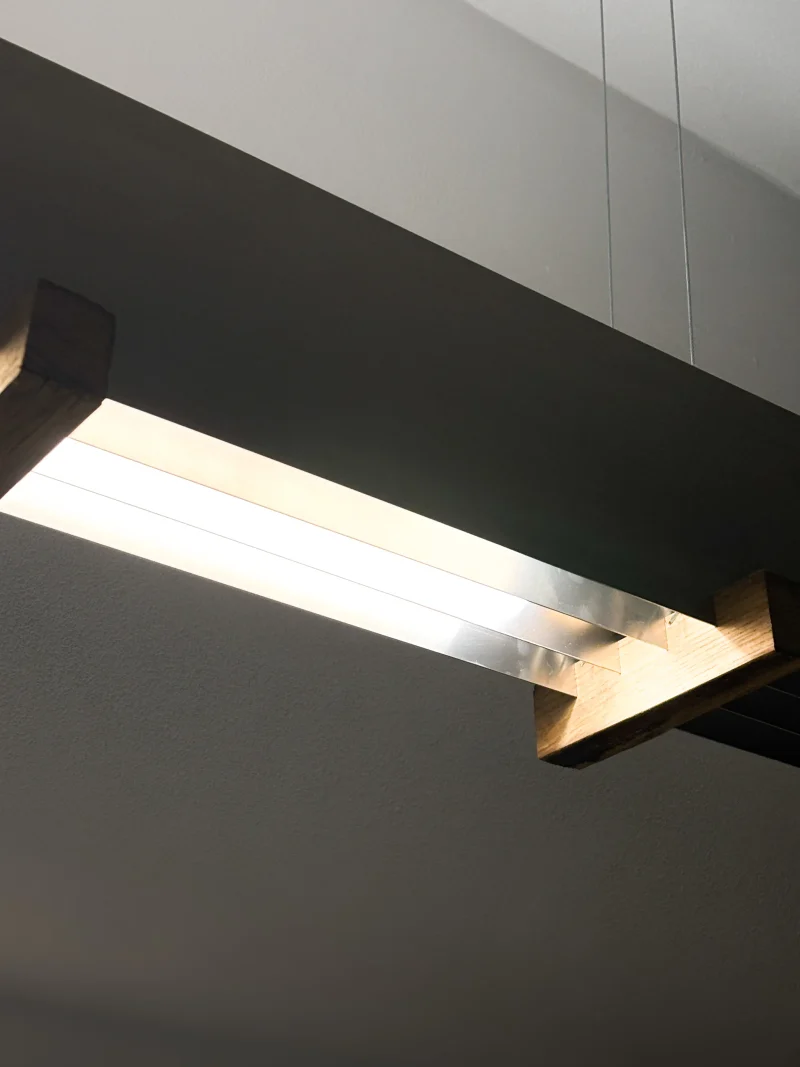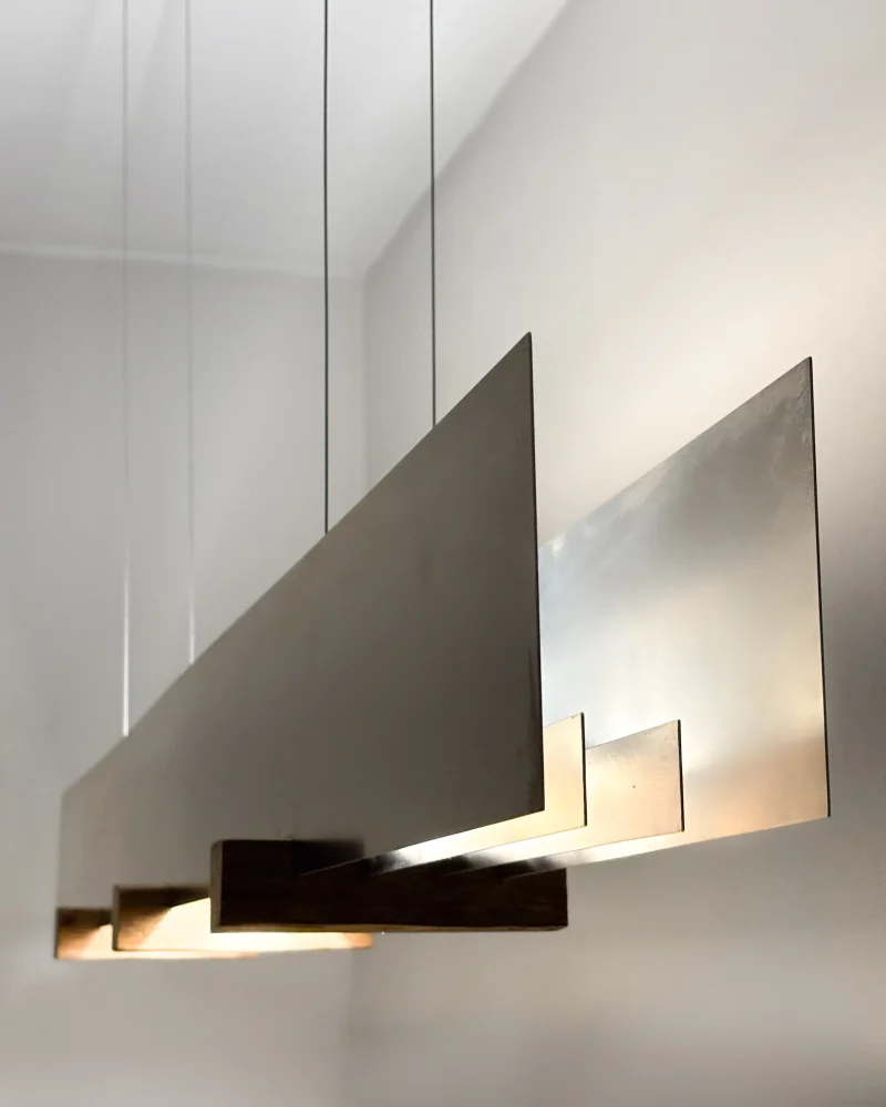 Linear Aluminium Elements “slicing” through three Wooden Carriers, creating a Sculptural Pendant Light, that reflects on traditional designs of office lighting but with a design driven reimagination, using aluminium parts, to create a Linear Design, that plays with Light, Reflection and Shadows.