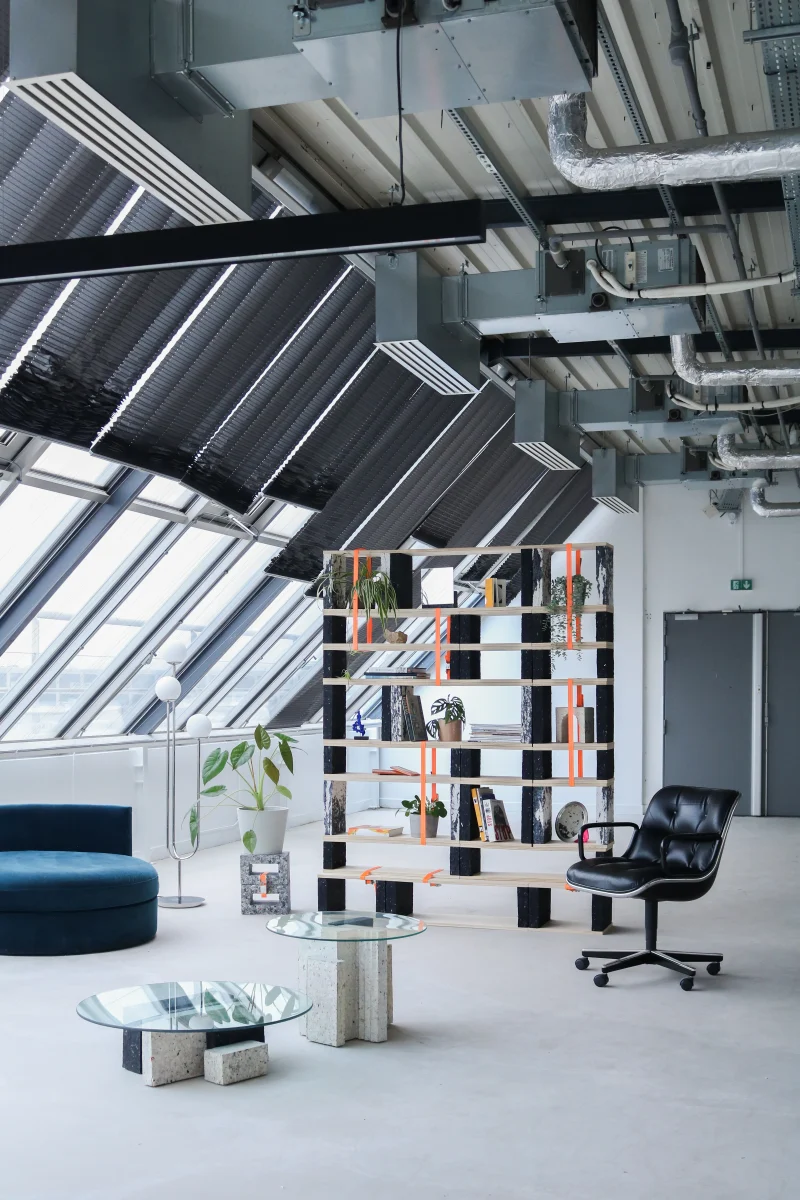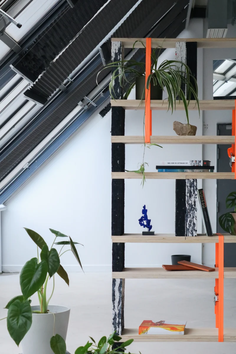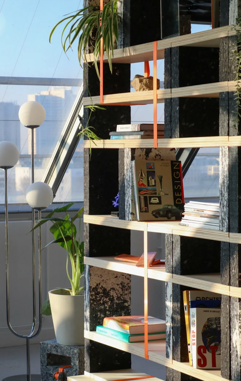 Une bibliothèque modulable, entre souplesse et structure, où le textile se fait pierre et le noir dialogue avec le blanc.