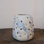 From the Little Rock series, inspired by the sedimentary formations of Point Dume—where land meets sea in endless conversation. Soft blue-grey glaze pools and drips like ocean foam kissing the shore, while handmade pebbles, each glazed with wild clay gathered from the California mountains, are embedded into the cream surface like a beach’s natural mosaic. Each mark tells a story of tide, time, and terrain.