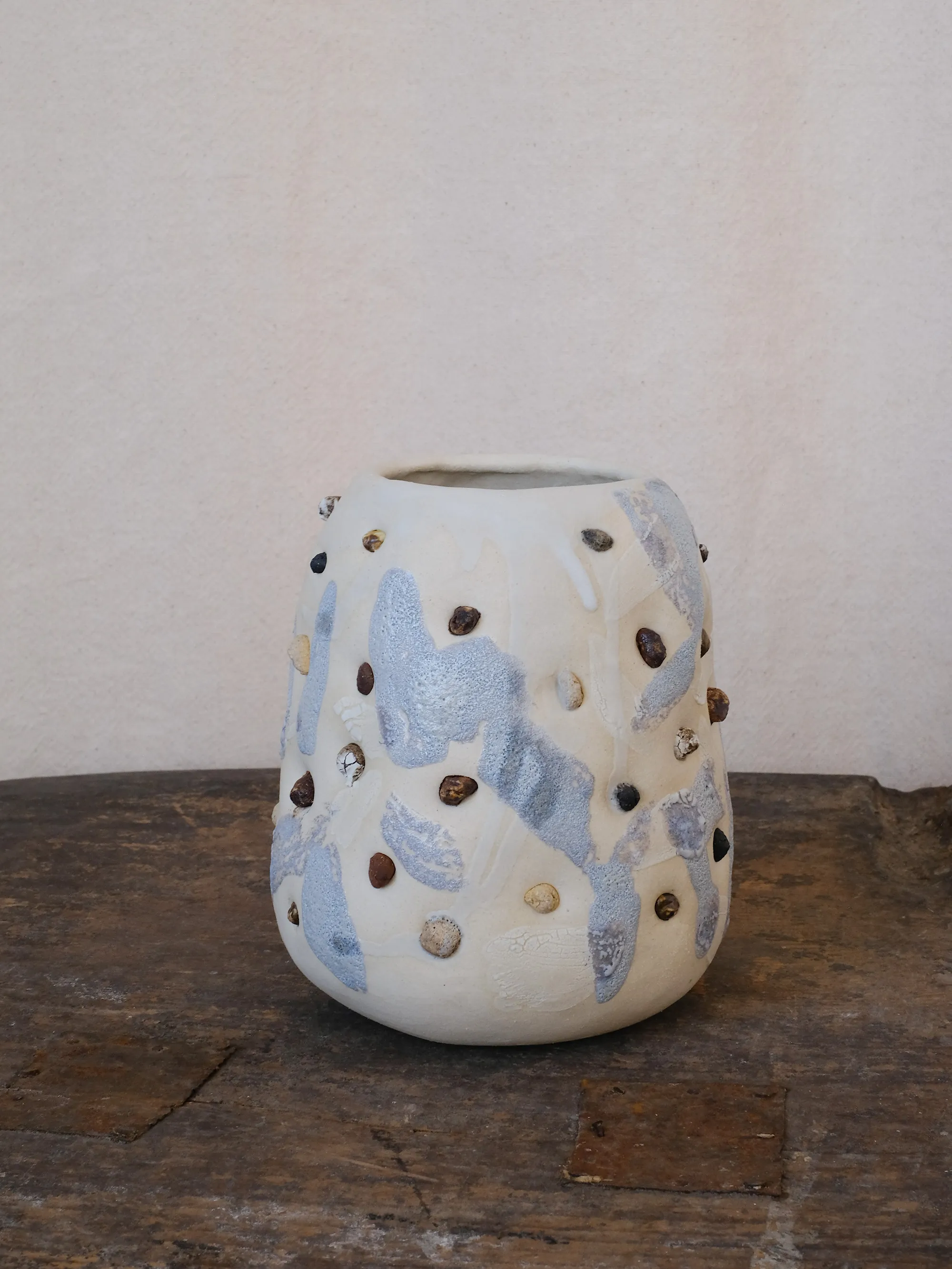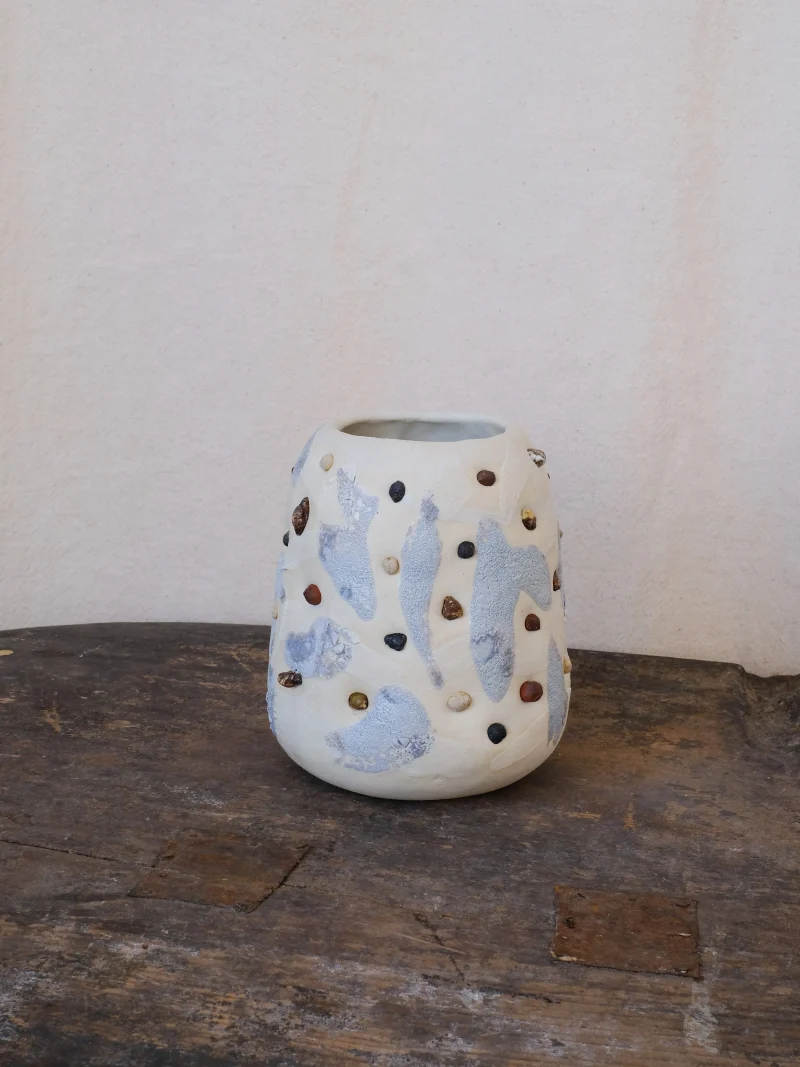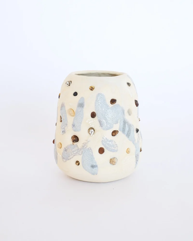 From the Little Rock series, inspired by the sedimentary formations of Point Dume—where land meets sea in endless conversation. Soft blue-grey glaze pools and drips like ocean foam kissing the shore, while handmade pebbles, each glazed with wild clay gathered from the California mountains, are embedded into the cream surface like a beach’s natural mosaic. Each mark tells a story of tide, time, and terrain.