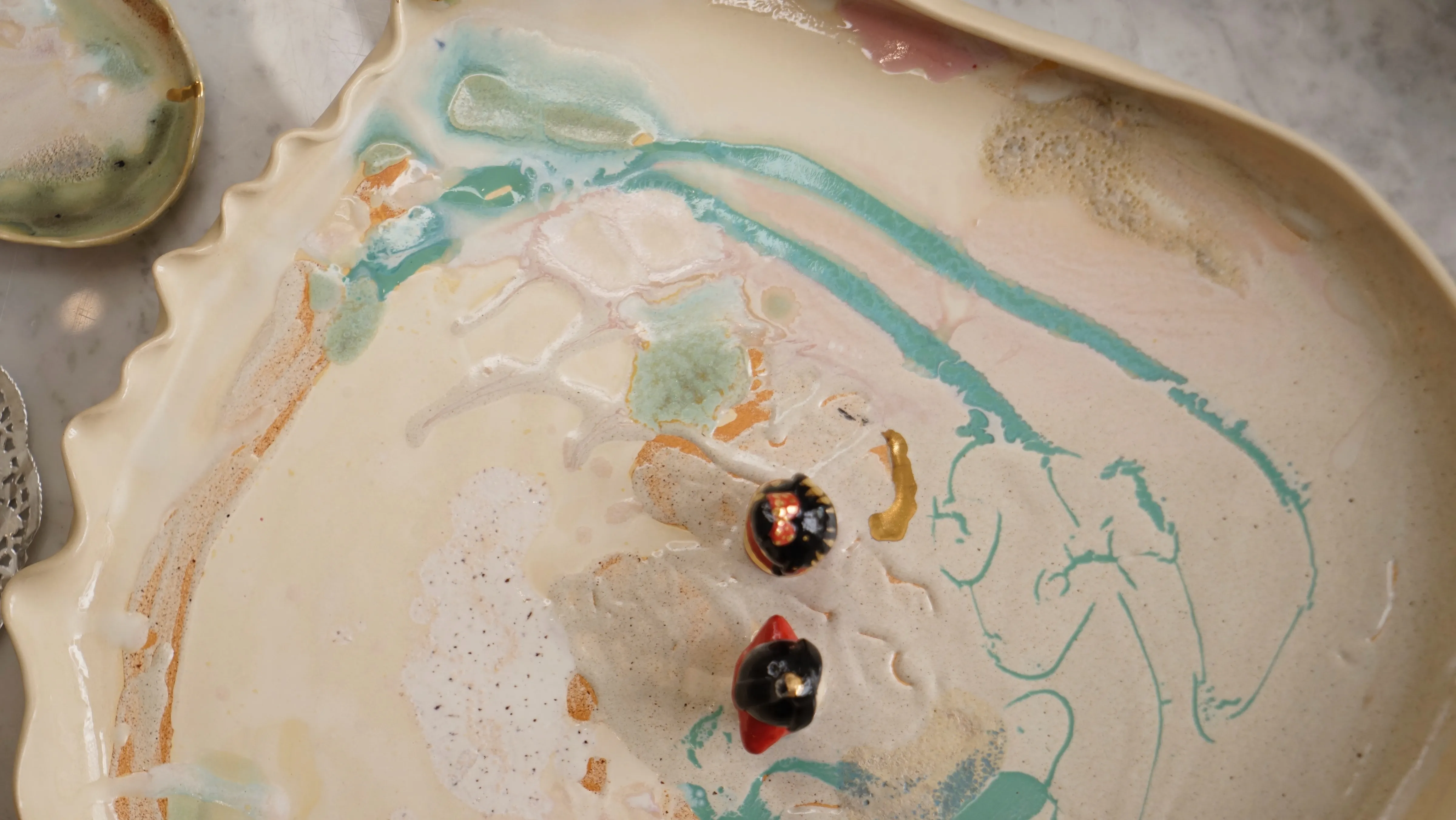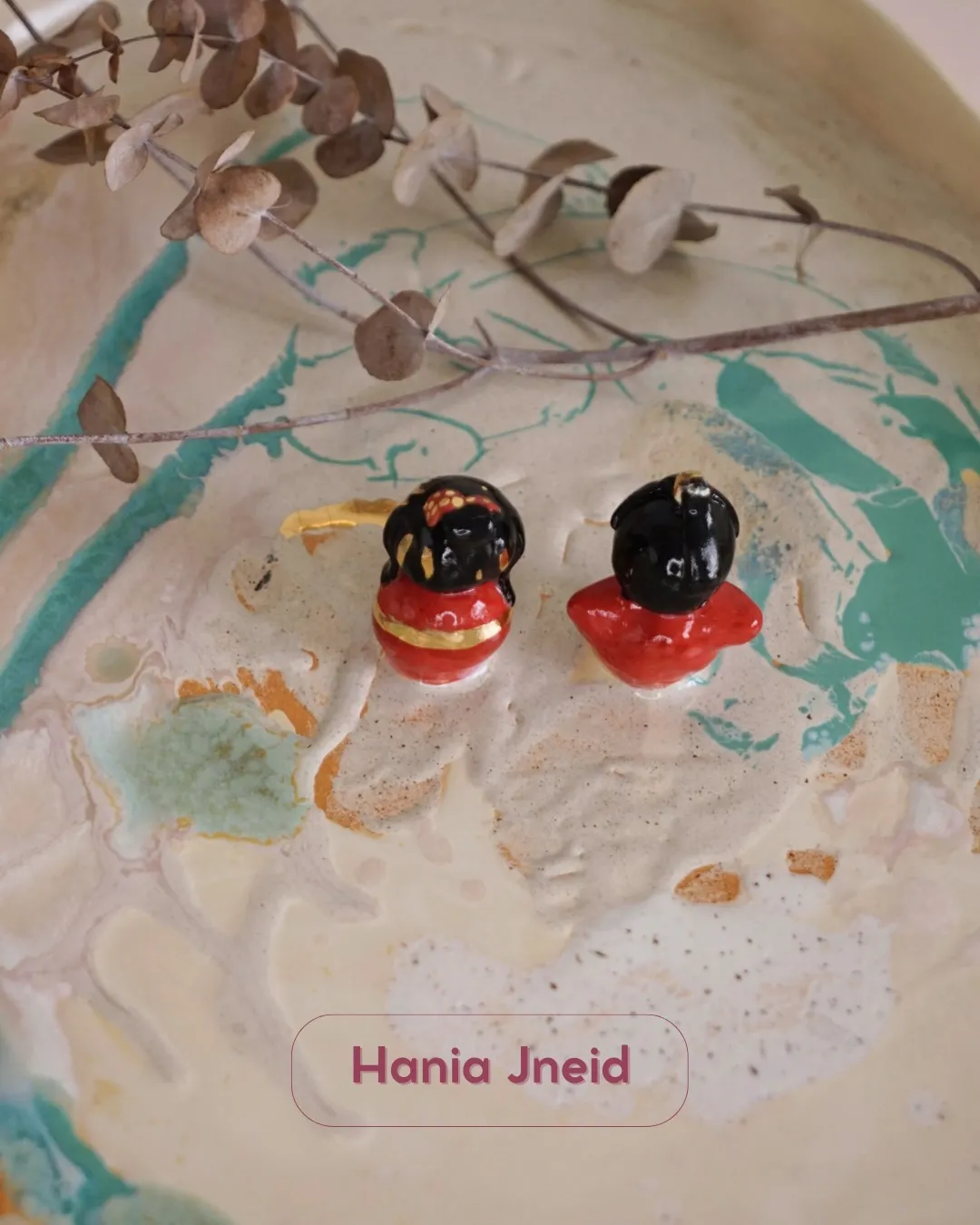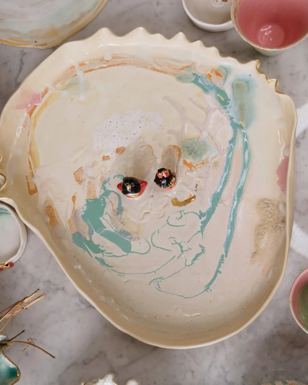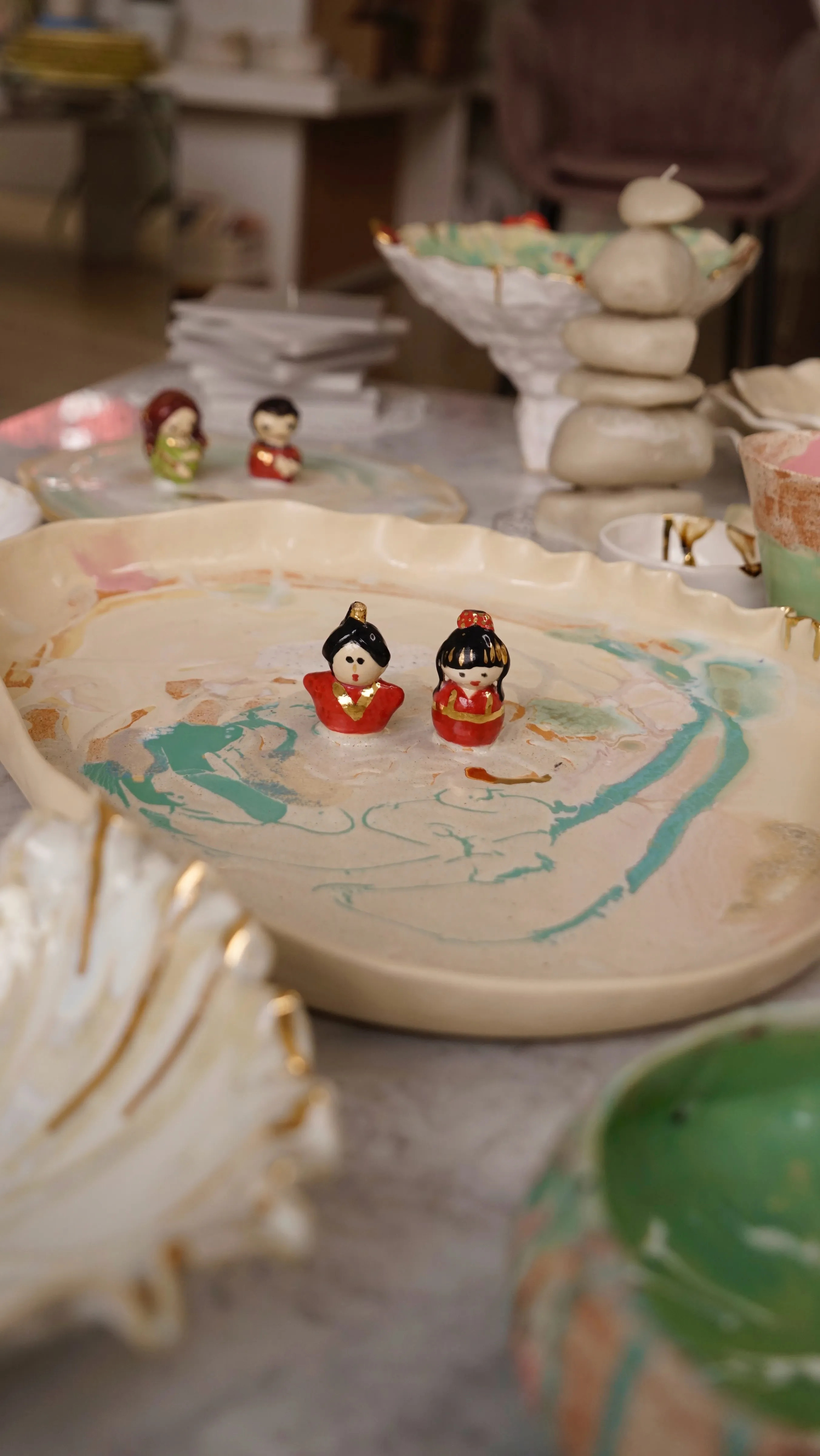 Each piece is lovingly handcrafted by Hania Jneid, carrying within it the spirit of a child’s imagination and the reverence of traditional craftsmanship. The organic shapes, joyful colors, and gold-kissed imperfections speak of a world where laughter meets ceremony, where art and function intertwine at the table.