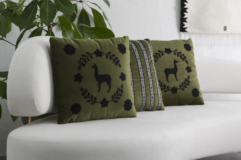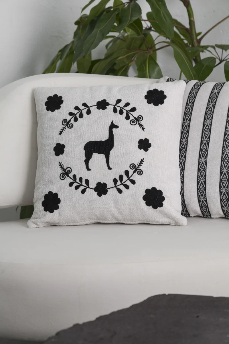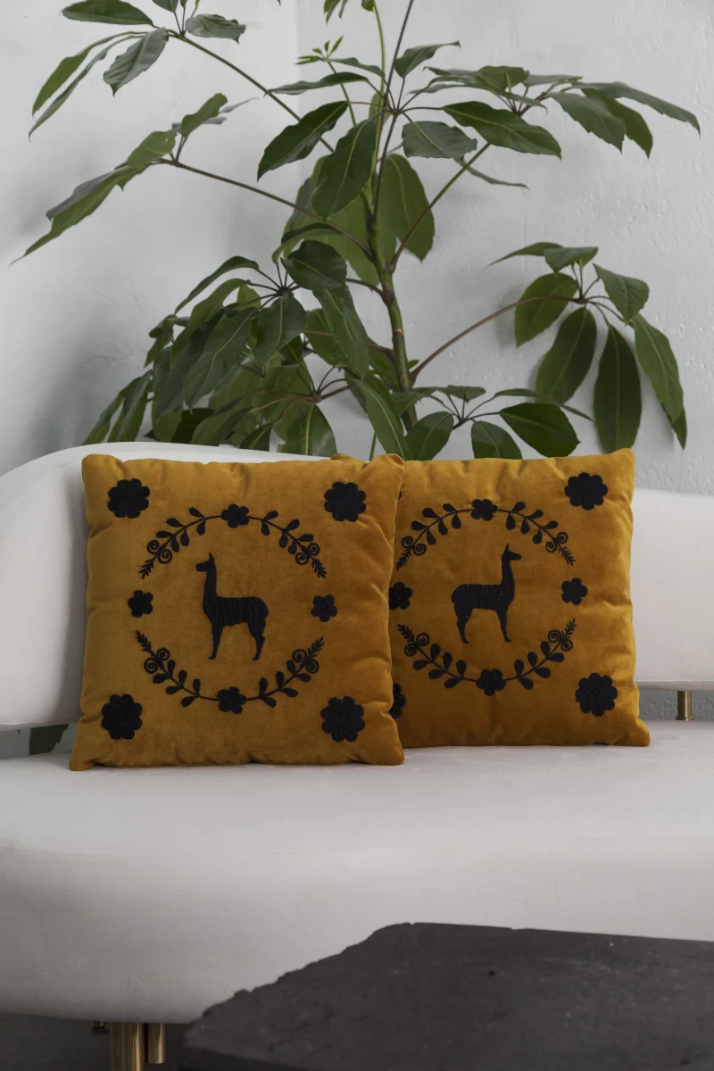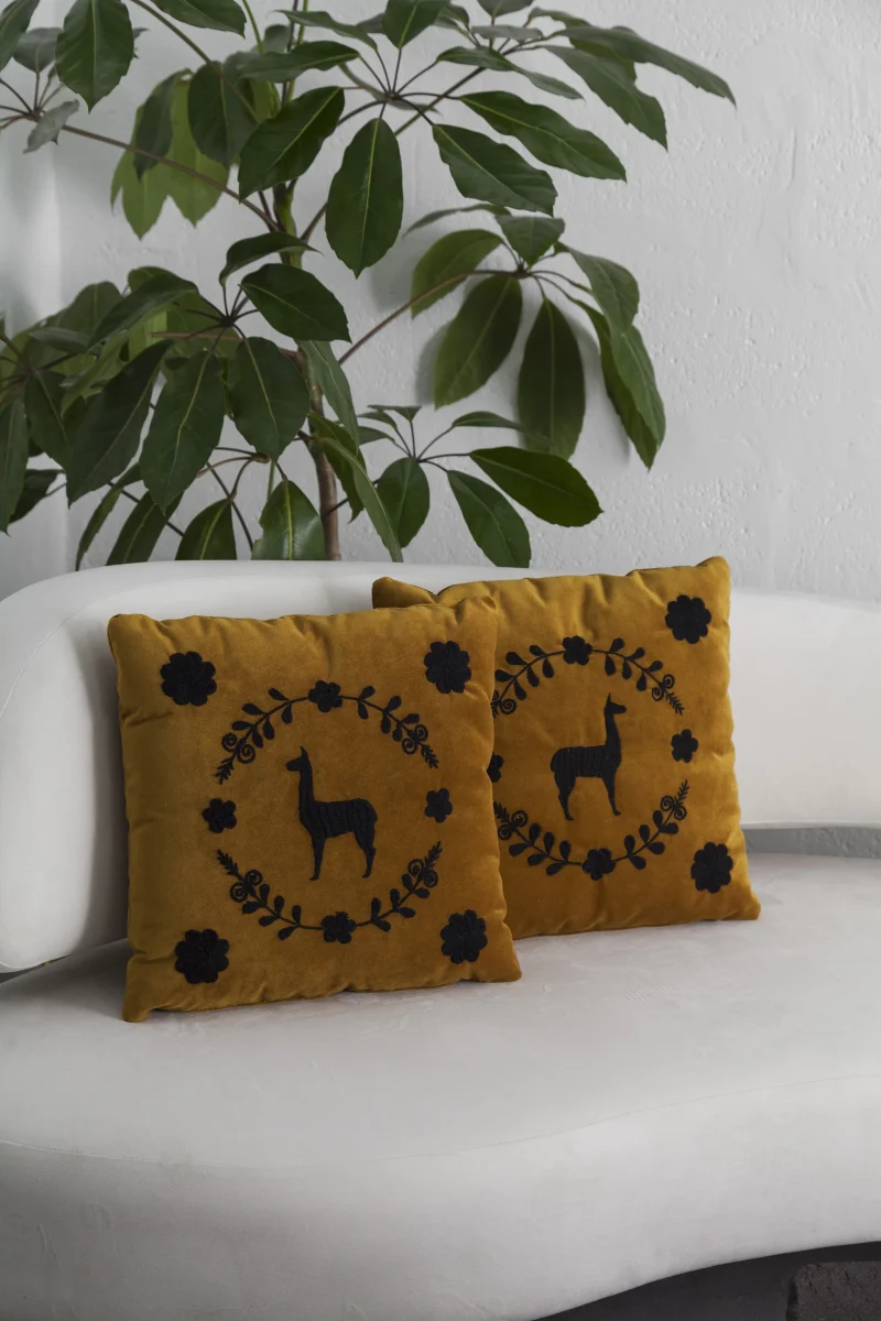 Decorative pillows with hand-embroidered llama motif from Zuleta, Imbabura, and waterproof velvet or upholstery fabric.