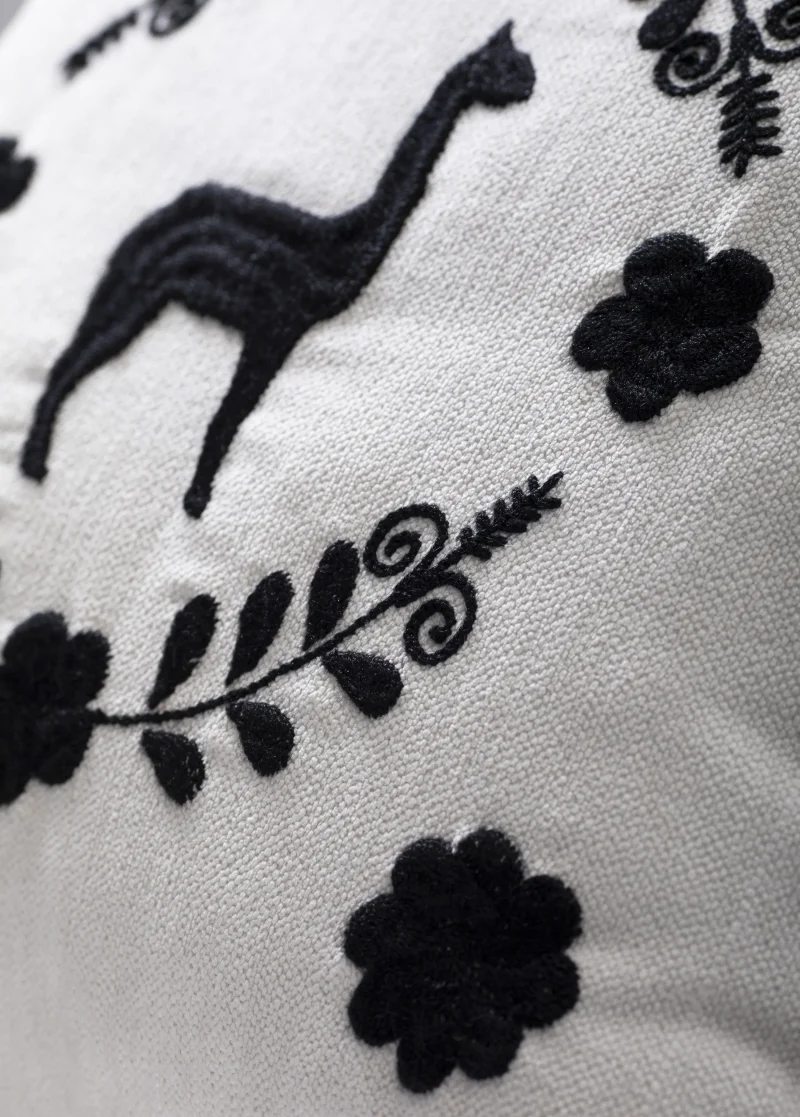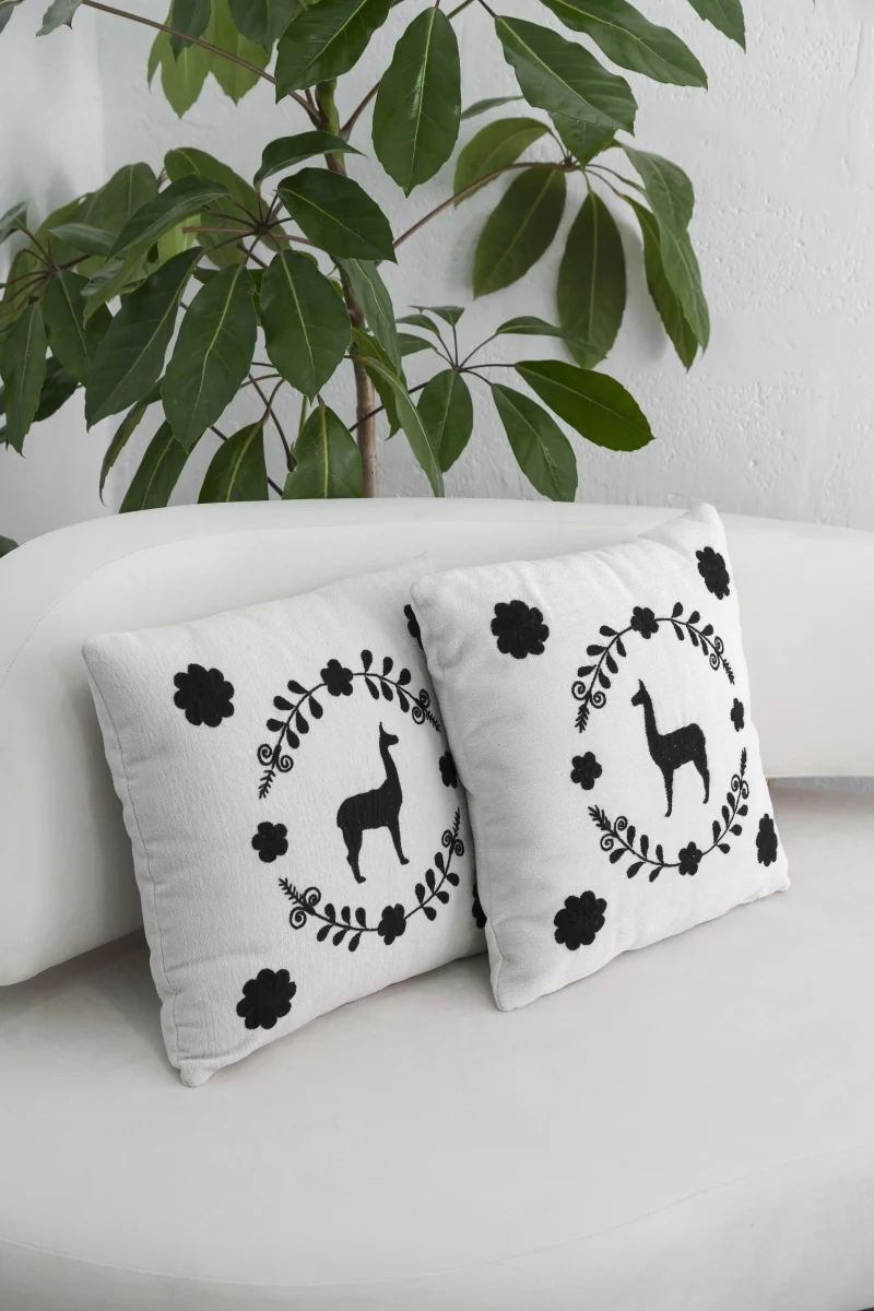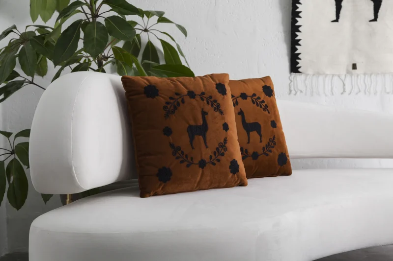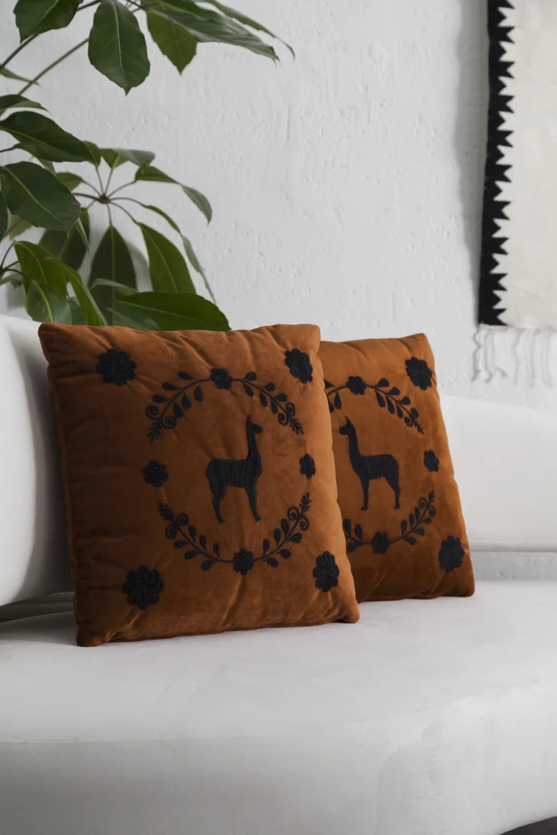 Decorative pillows with hand-embroidered llama motif from Zuleta, Imbabura, and waterproof velvet or upholstery fabric.