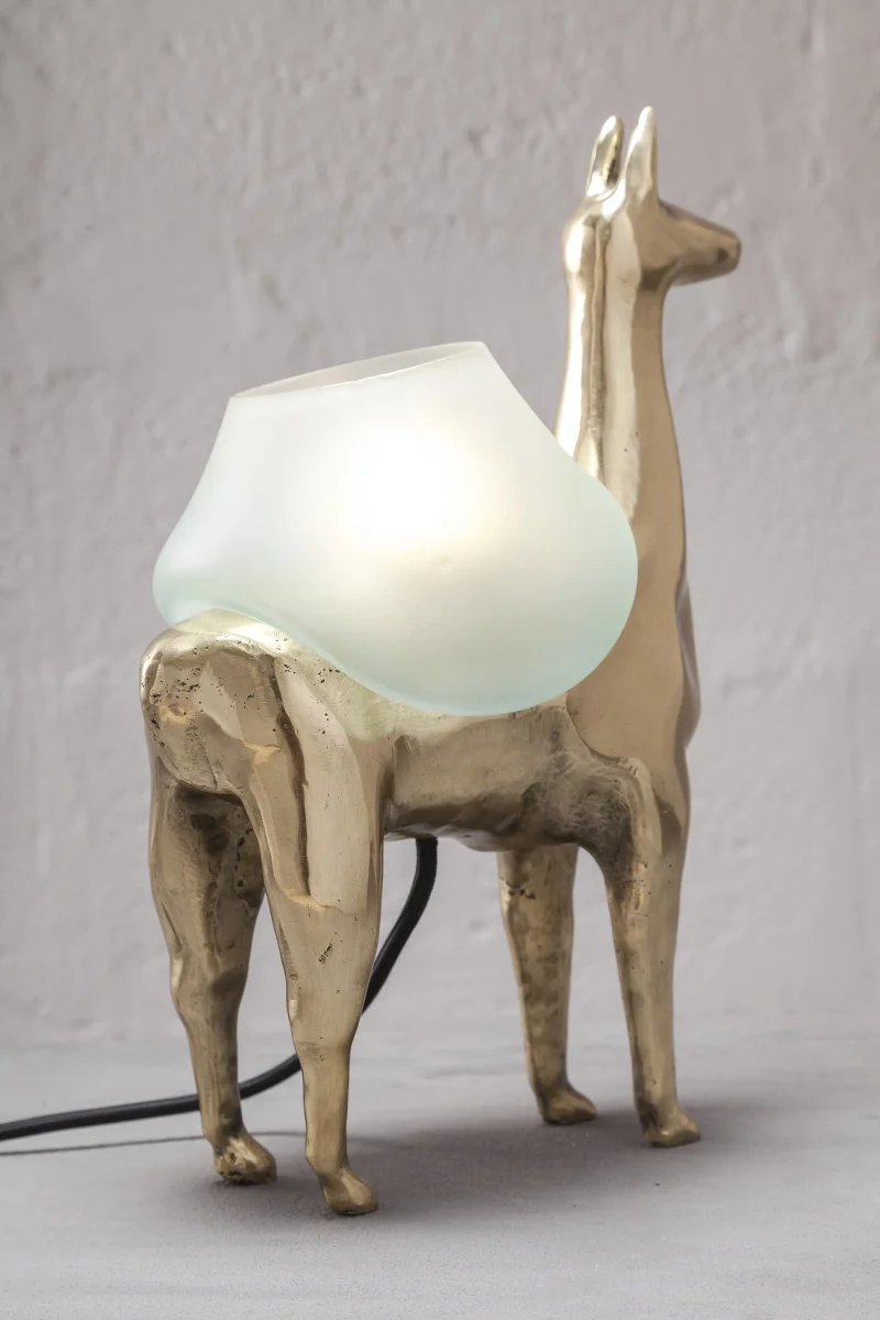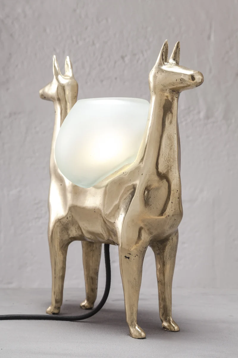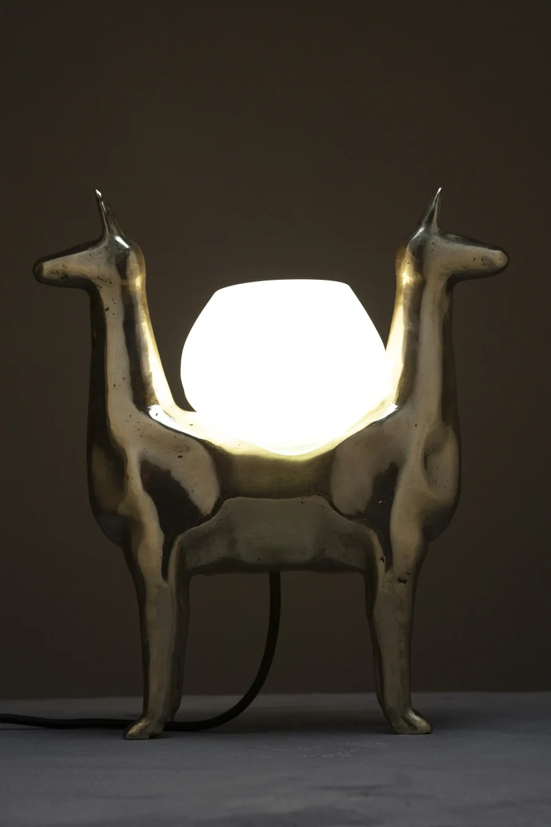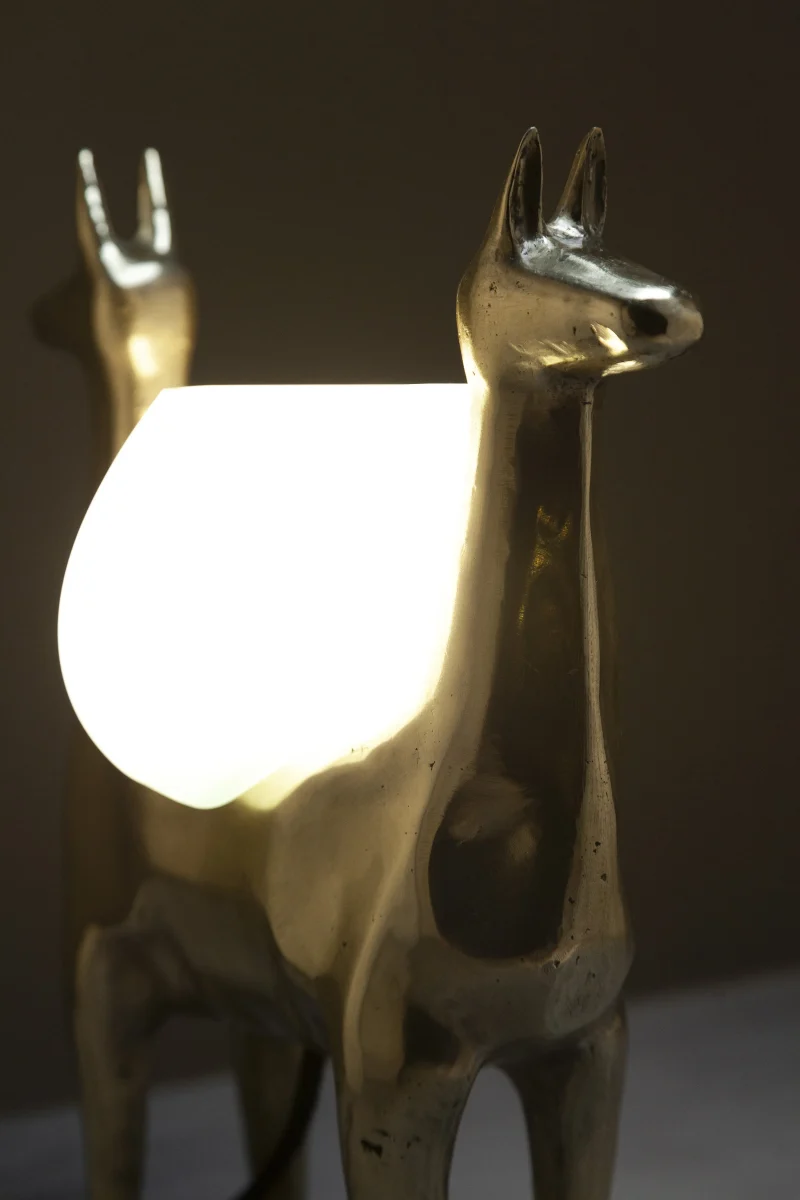 LLAMAS is a table lamp, composed of a lost-wax cast bronze body, and a blown glass lampshade. It is a reinterpretation of an archetype of llama sculptures essential within Ecuadorian artisanship. The
